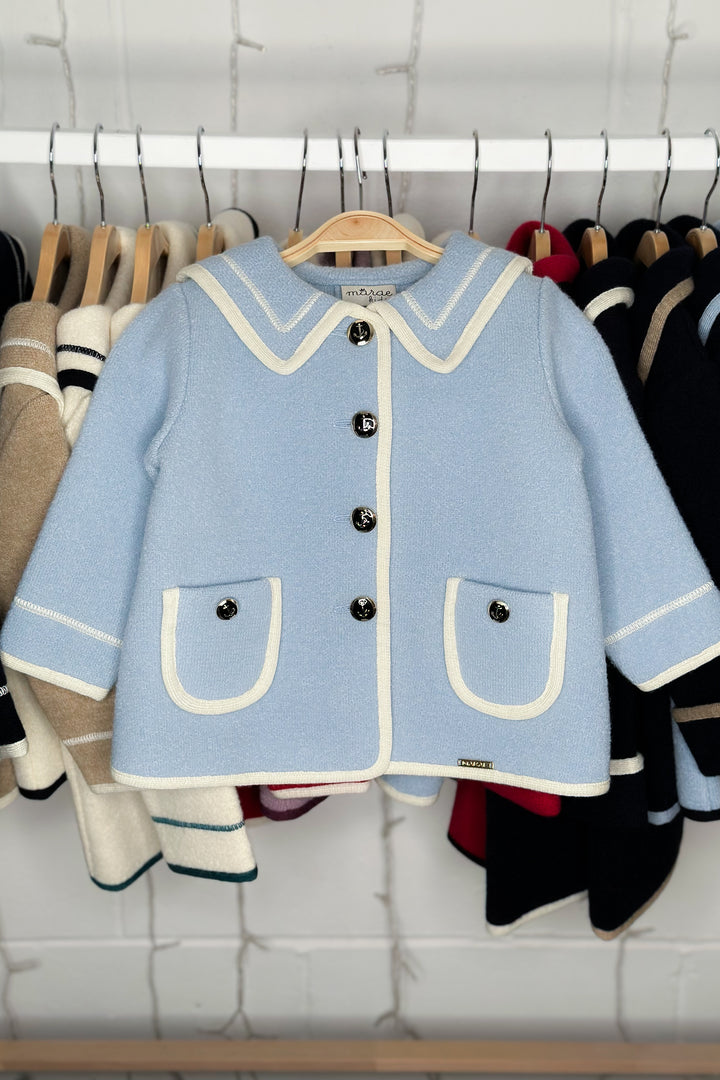 Fresh and charming, this MARAE Kids unisex coat in light blue with ivory trims captures the spirit of timeless sailor style with a softer, more playful touch. Handcrafted in Spain from the finest Austrian merino wool, it features a sailor-inspired collar, ivory edging, and polished gold button fastening. Designed to be generous in fit and made to last, this heirloom piece is perfect for boys or girls and brings a dreamy nautical elegance to any season.