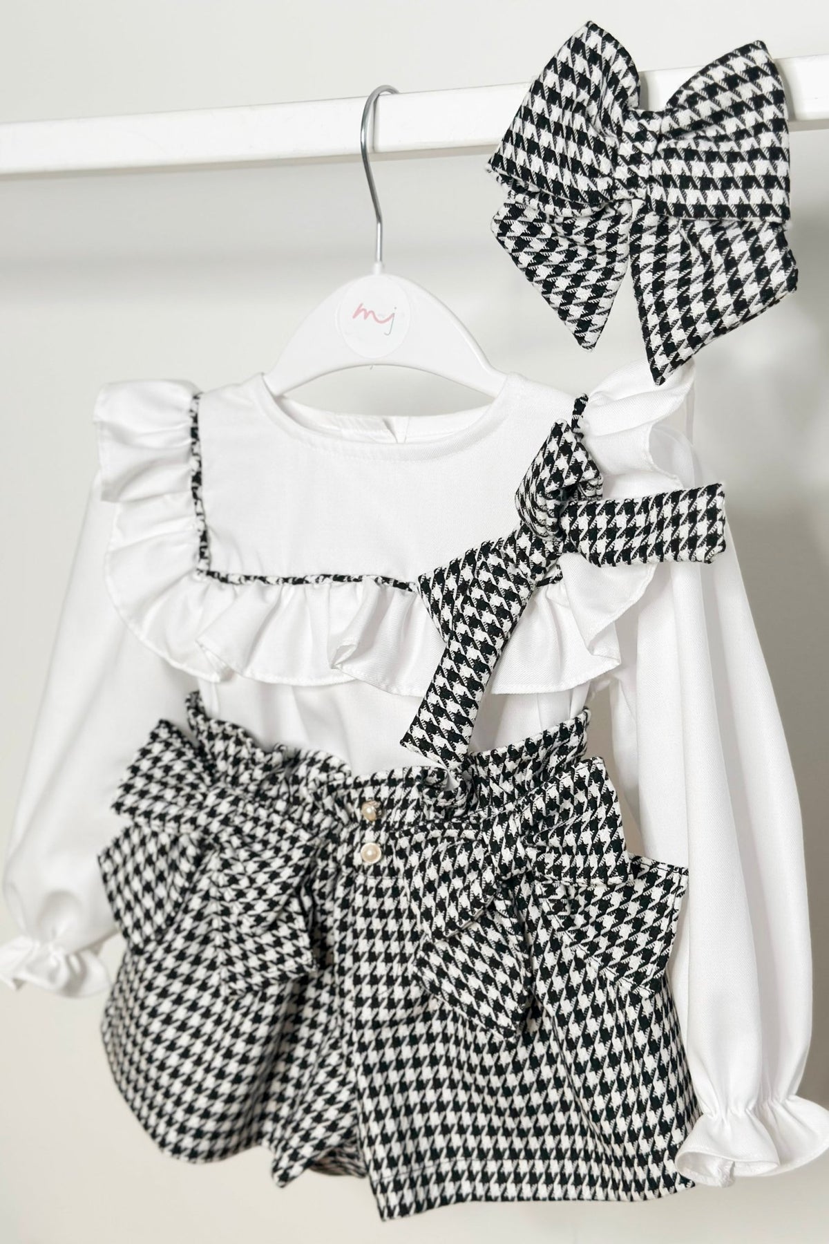 Smart, sophisticated and sweet all at once – this Fofettes x Be Chic set is the definition of effortless autumn charm. The crisp white blouse features a statement ruffle that sweeps across the chest and shoulders, delicately edged in houndstooth piping and finished with a matching oversized bow. The coordinating paper-bag-waist shorts bring texture and structure, adorned with two statement bows and dainty faux-pearl buttons for a refined finish. Thoughtful details make dressing simple and comfortable – mother-of-pearl buttons down the back, elasticated wrists for easy movement, and a softly gathered waistband that grows with your little one. A polished look for birthdays, family outings or festive occasions.