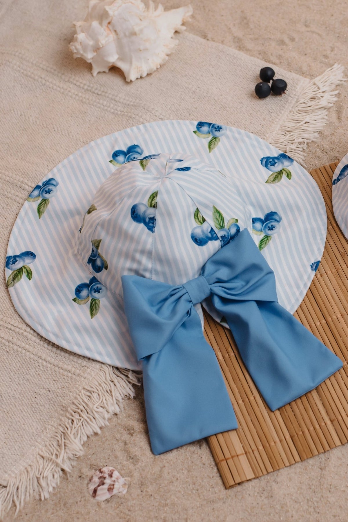 Girl's blue striped sun hat from Portuguese brand Meia Pata. Super soft blue and white striped blueberry print lycra sunhat, finished with a large dusky blue bow.