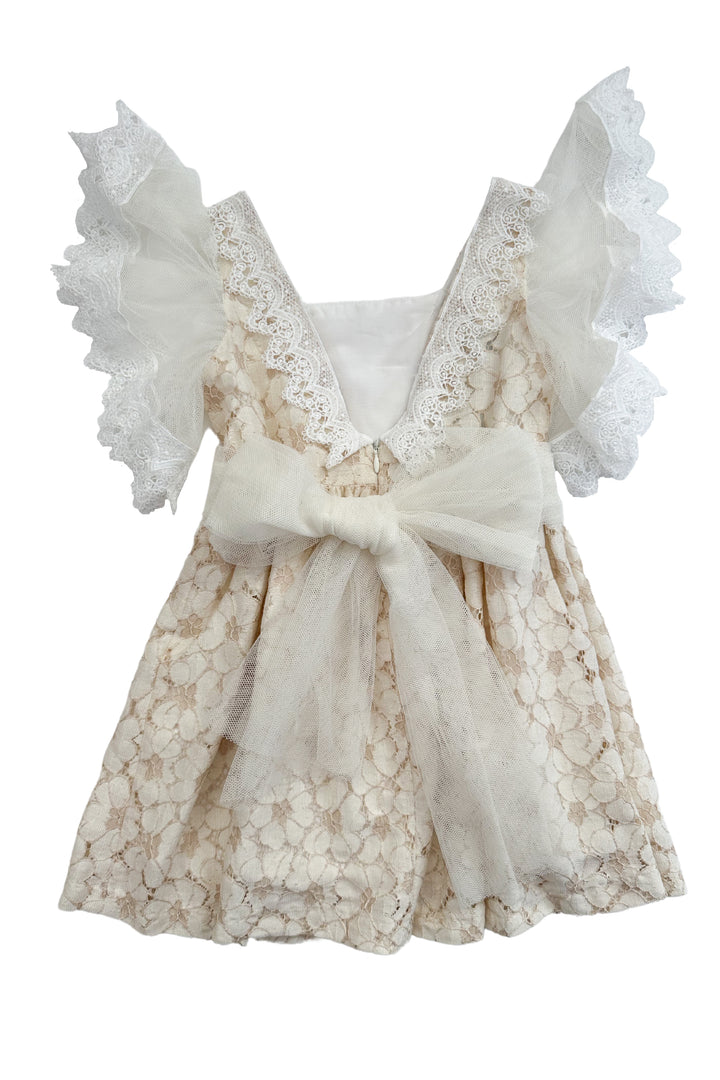 Girl's lace dress from Spanish brand Foque. Lightweight beige lace dress with stunning extra large ivory tulle and lace sleeves and low V-shape back, decorated with an extra large cream tulle bow belt. Finished with a luxurious natural mother of pearl branded tab to chest.