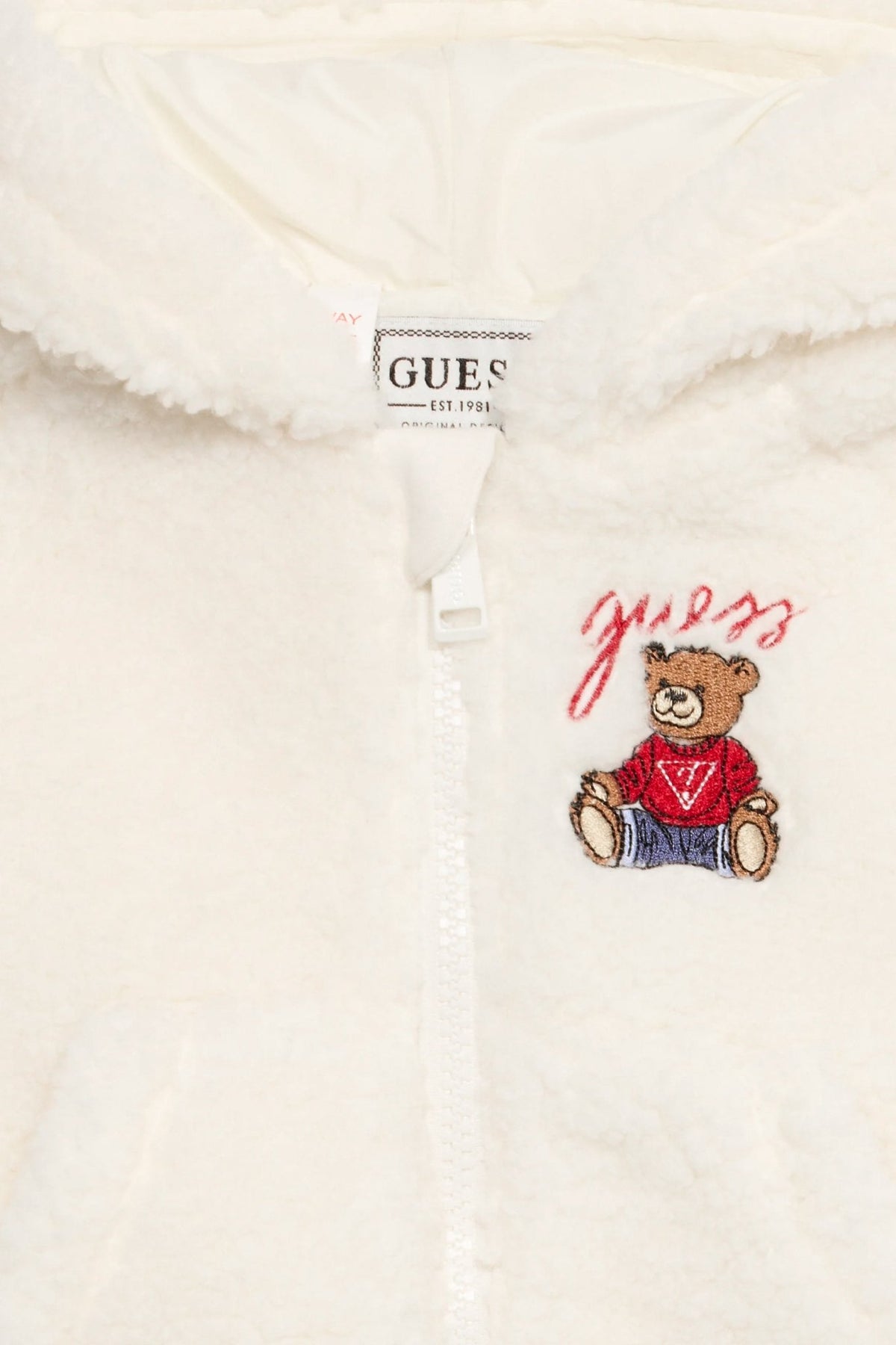 Keep your little one snug and smiling in this irresistibly soft GUESS® Kids teddy jacket. Lined with silky satin for comfort and warmth, it’s the kind of piece you’ll reach for on every chilly morning. The cosy sherpa texture feels like a gentle hug, and the sweet embroidered teddy and red Guess logo add that touch of timeless charm.