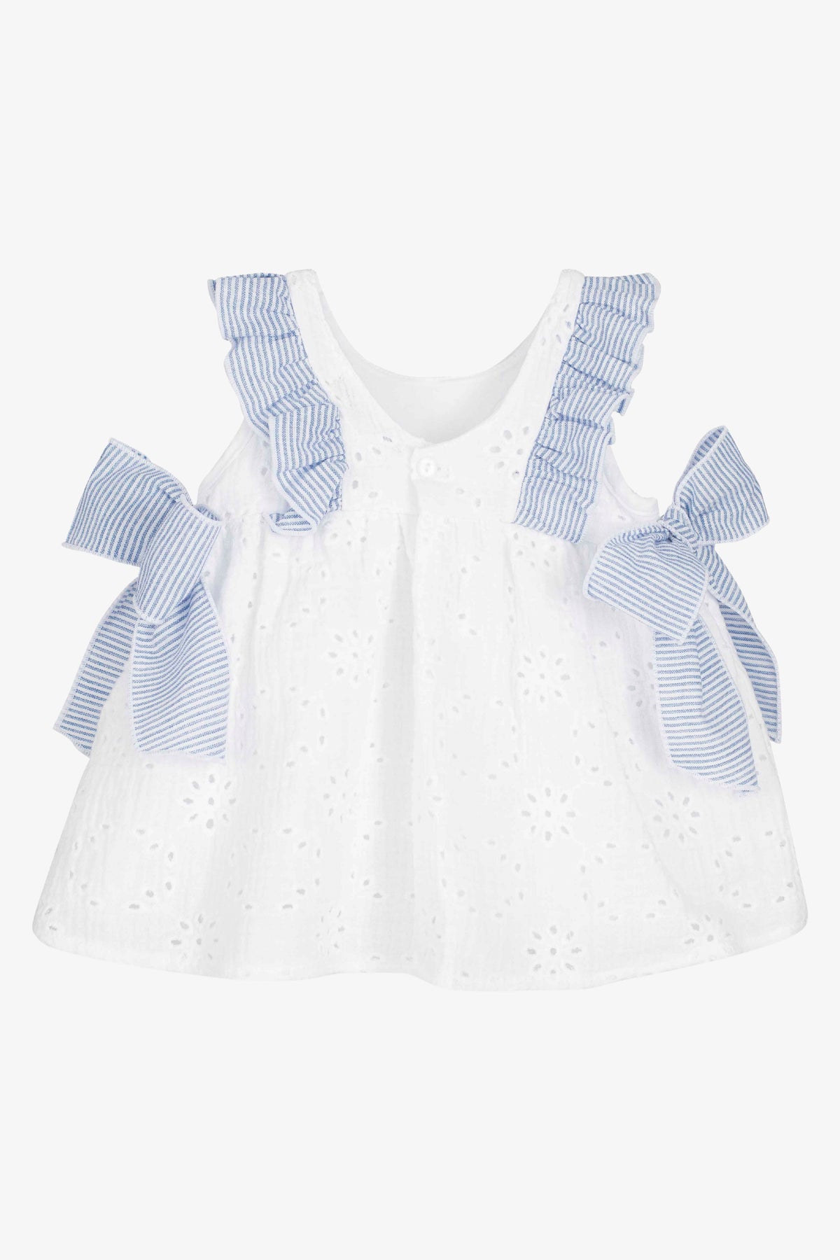 Finished with a blue-and-white striped ruffle over the shoulders and sweet coordinating bows at each side of the waist, the design feels delicate yet playful. The V-shaped back adds an extra-special touch, fastening with pearlised buttons for easy dressing. A lovely choice for summer celebrations, holidays, or simply dressing up everyday moments.