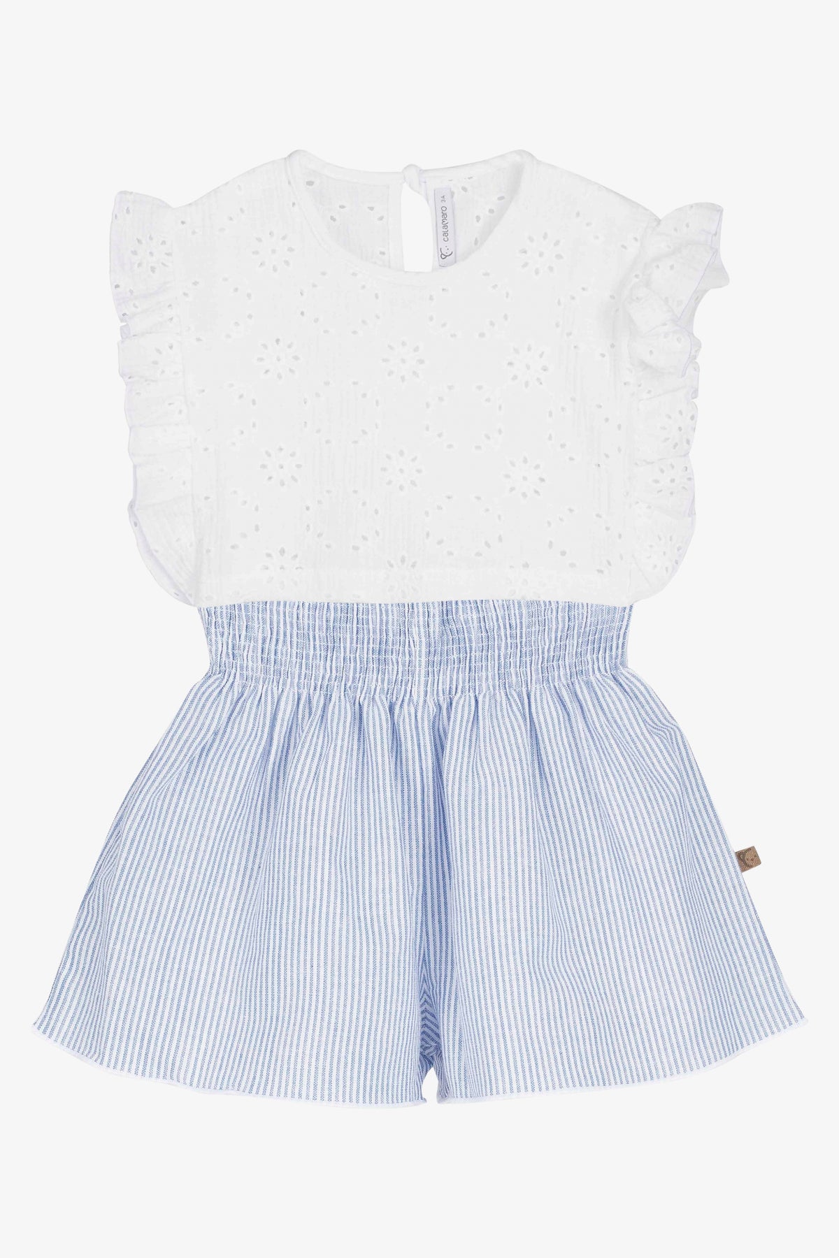 "Dottie" White Broderie Anglaise Top & Blue Striped Shorts