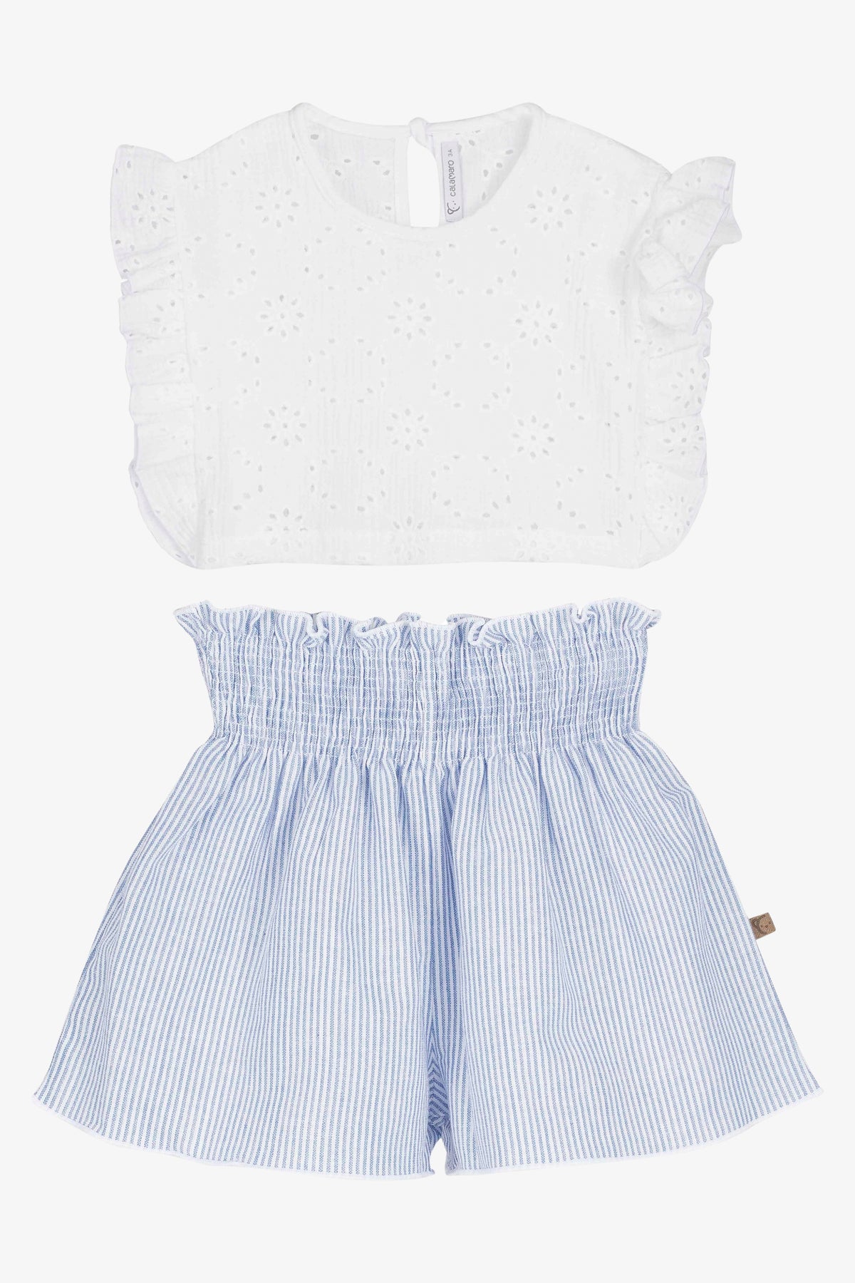 A beautifully fresh two-piece summer set from Calamaro, perfect for warm days and effortless dressing. The soft white cheesecloth broderie anglaise top features delicate ruffle sleeves and a cropped silhouette, fastening at the back of the neck with a sweet tie detail for an easy, comfortable fit.