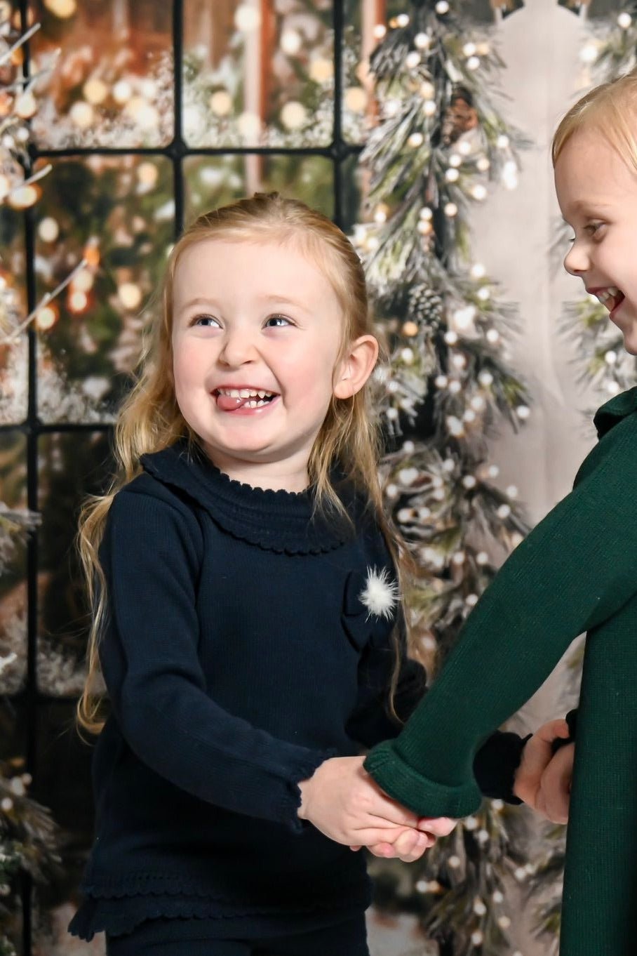 Baby girl's knit outfit set from Spanish designer Artesanía Granlei. Navy mid-weight knitted long sleeve top with pretty crochet knit collar, paired with matching knit shorts with skirt. Decorated with a knit bow topped with a soft fur pom pom.