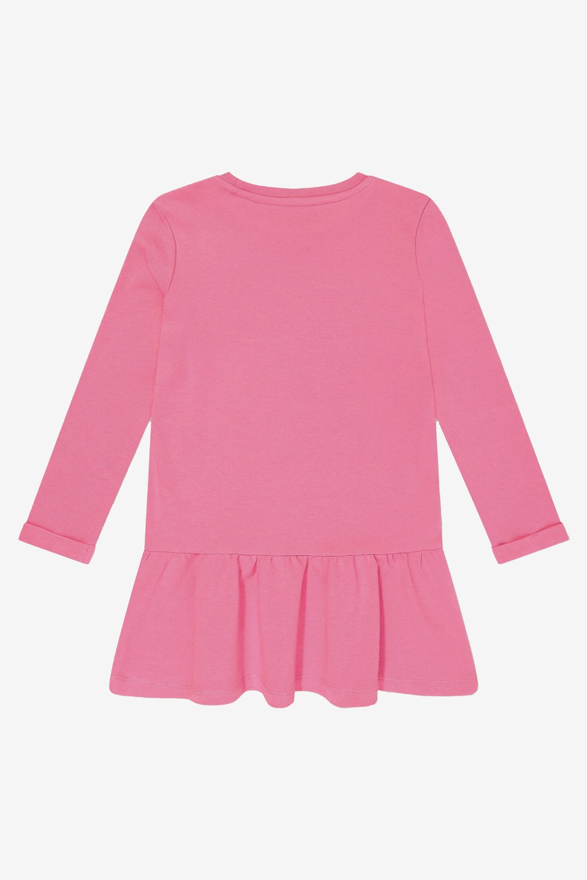 Playful, comfy, and full of sparkle – this hot pink GUESS® Kids dress is a little girl's dream come true. Made from soft, stretchy jersey cotton, it features the signature GUESS® logo surrounded by glittery teddy and heart prints for a fun, girly touch. The drop-waist skirt adds a sweet silhouette that’s perfect for twirling, while popper fastenings to the back of the neck make dressing easy for baby sizes. The smallest sizes (9–24 months) come with matching bloomers to complete the look.