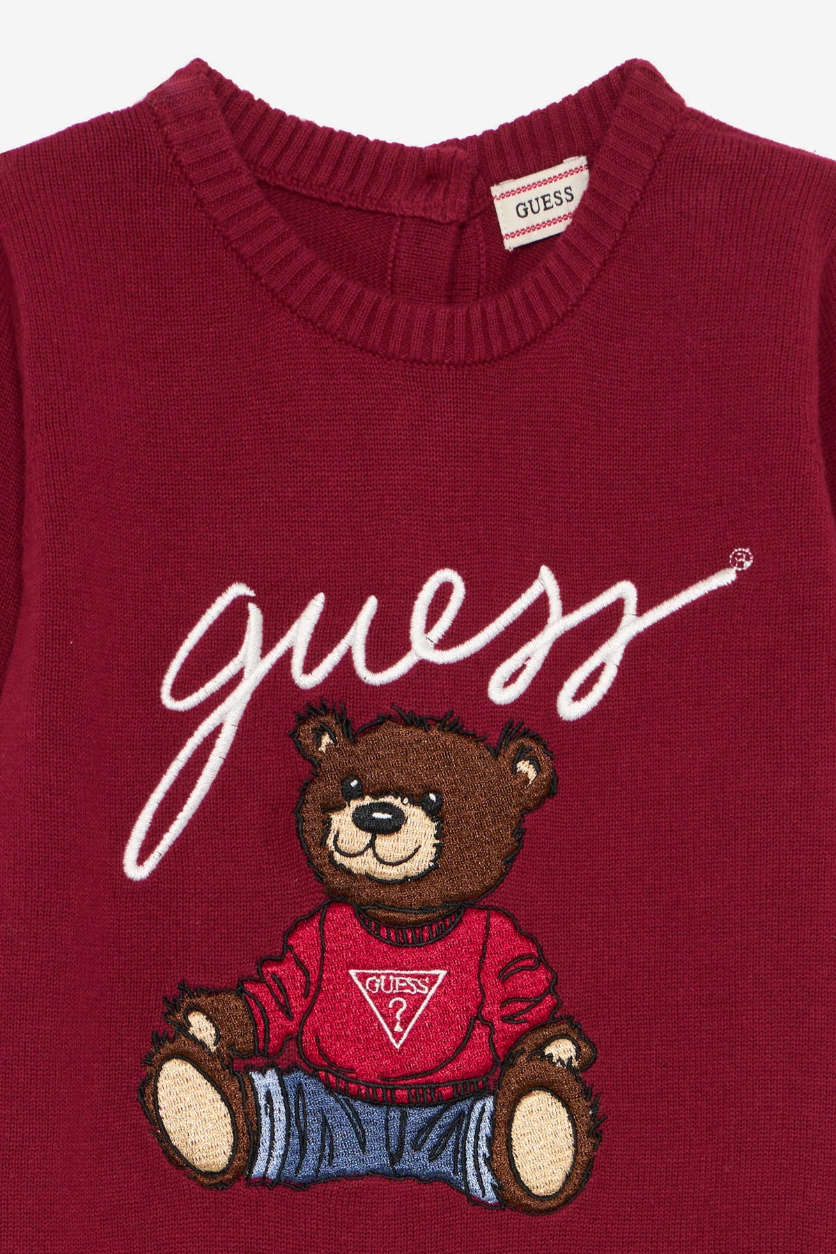 The fine knit design features the iconic red Guess logo and teddy bear motif – a sweet touch that brings timeless warmth to their wardrobe. With buttons to the back and concealed poppers at the legs, changes are quick and easy, even during those busy holiday moments.