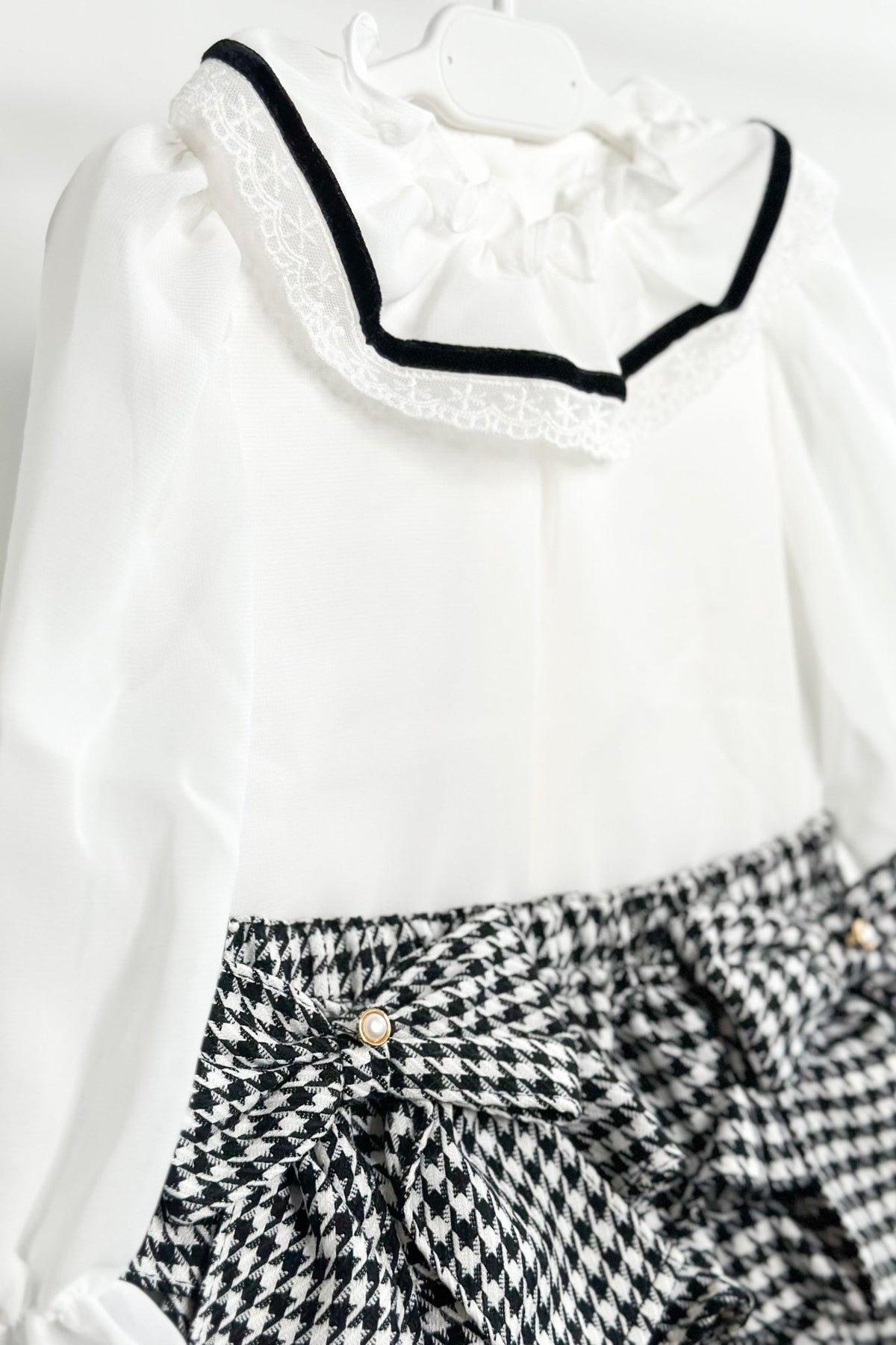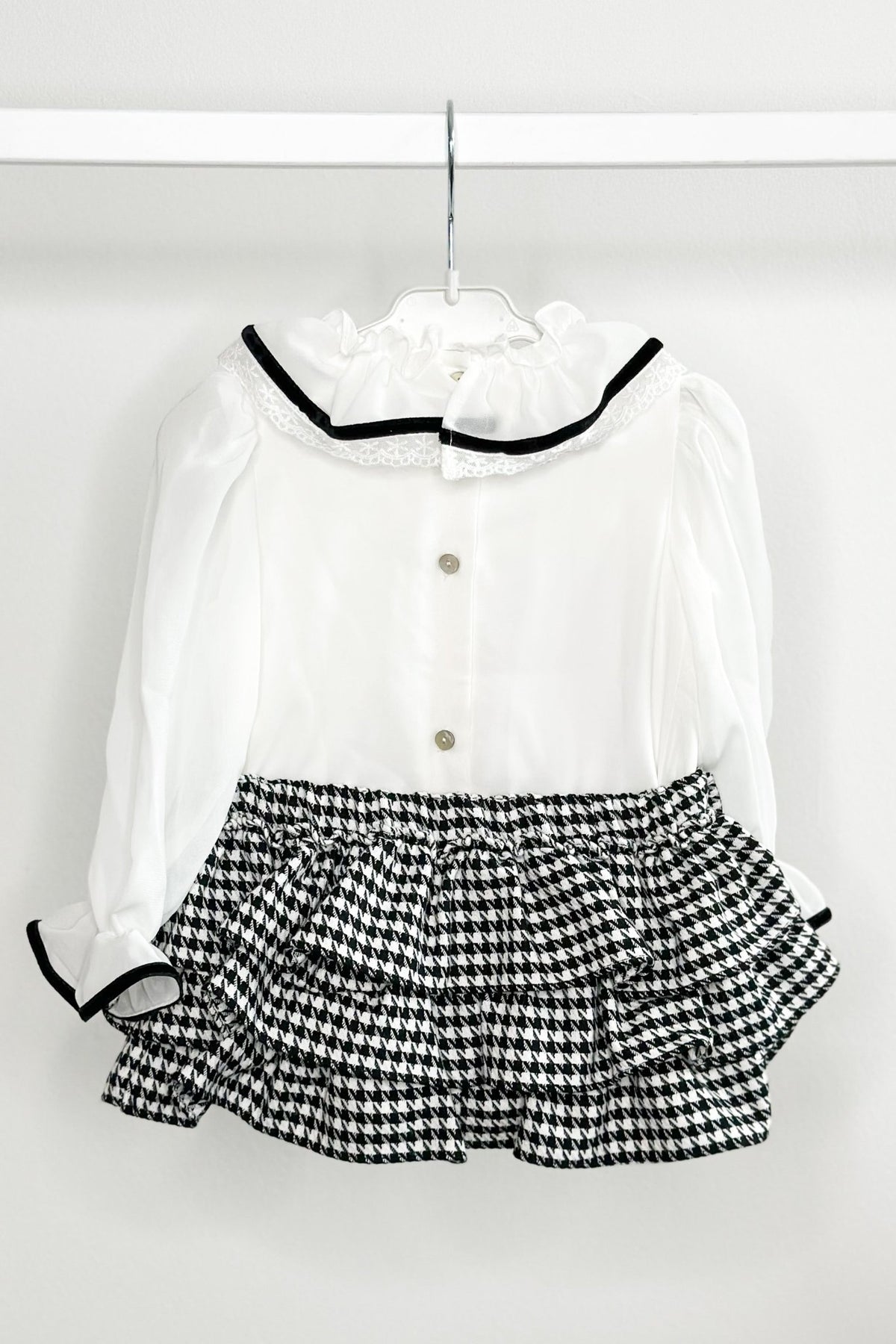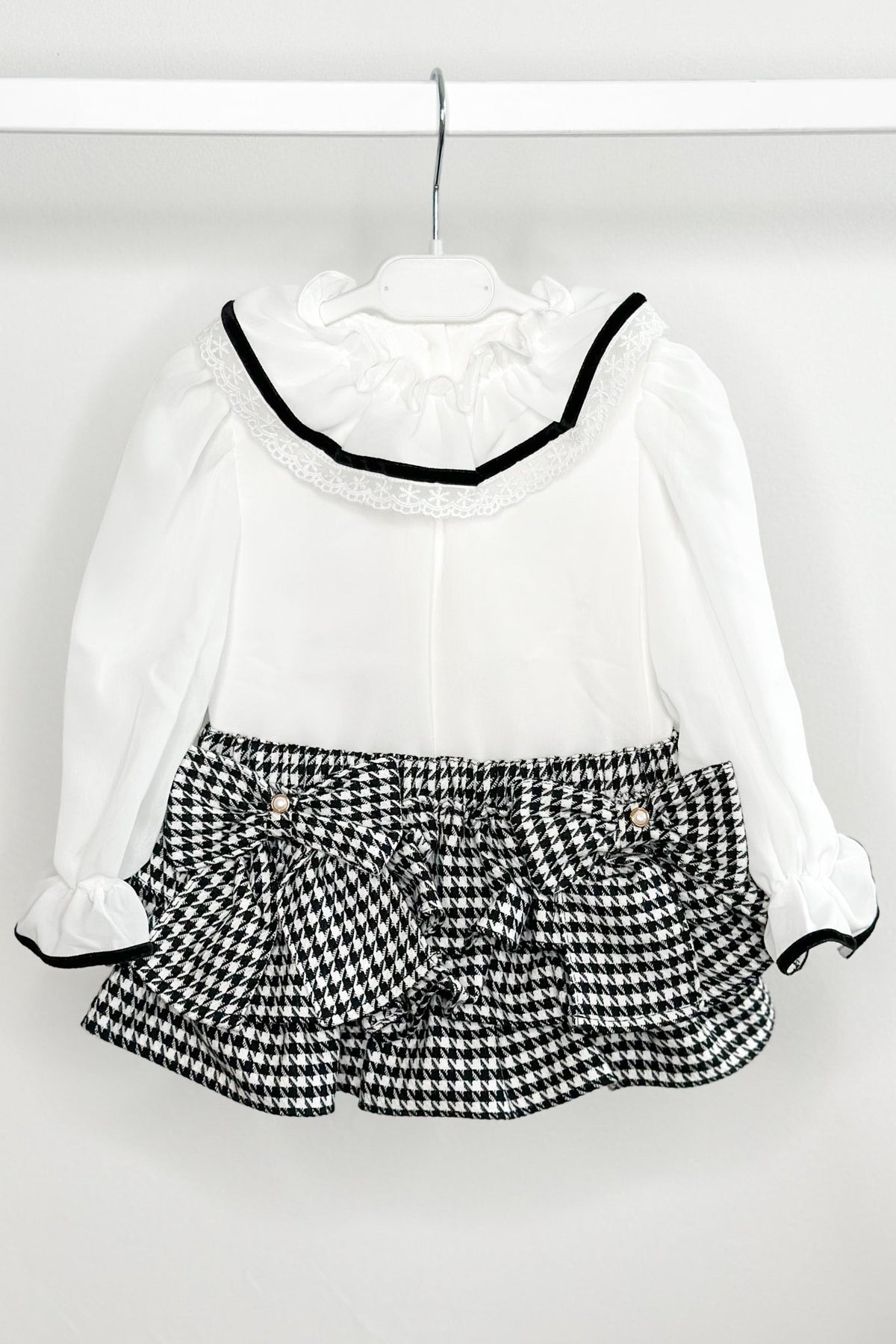 Girl's houndstooth outfit set from Dutch brand Fofettes. Stylish white chiffon long sleeve blouse with pretty ruffle collar edged with luxurious black velvet and lace trim, paired with soft black and white houndstooth print layered skort decorated with two bows topped with faux pearl buttons.