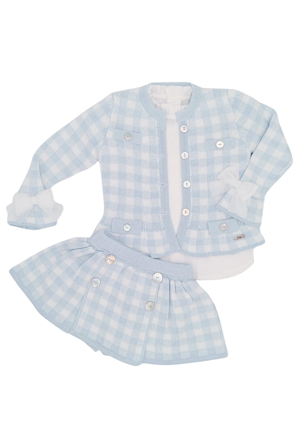 "Martha" Baby Blue Gingham Knit Cardigan, Blouse & Skort