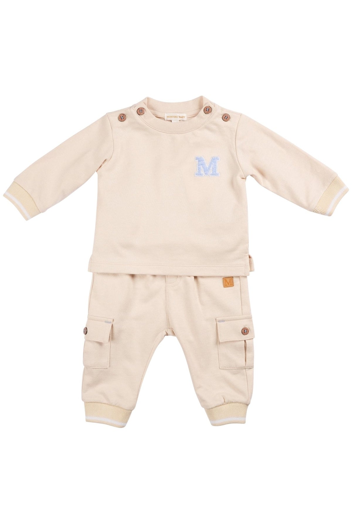 This Mintini loungewear set combines casual comfort with stylish details. The lightweight jersey cotton sweatshirt, in a soft sand hue, features a classic crew neck and the signature blue terry towelling "M" emblem for a subtle branded touch.
