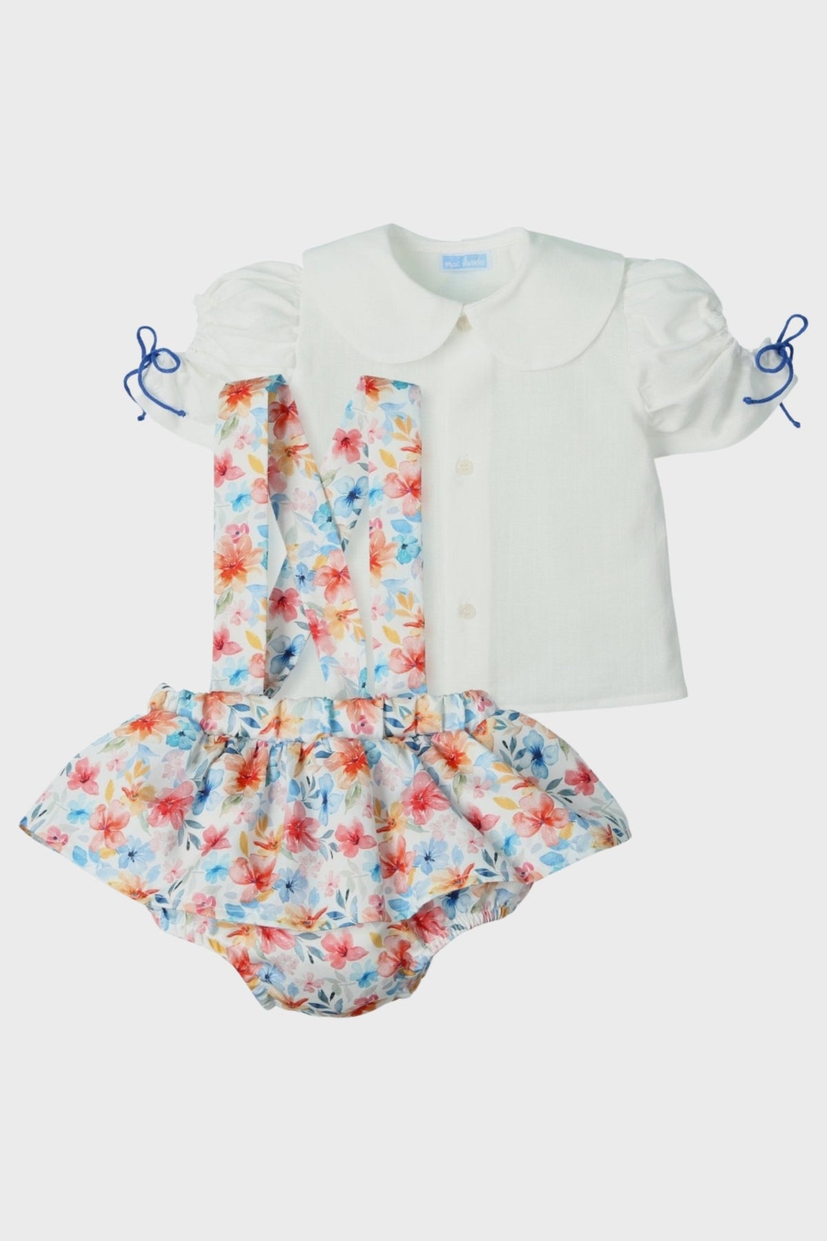 A beautiful statement outfit for your baby girl, this Mac Ilusión set includes a super lightweight white cotton blouse with an oversized Peter Pan collar and ruched short sleeves, finished with dainty dusky blue bows. It pairs perfectly with a bloomer skirt in a vibrant watercolour floral print, complete with integrated bloomers and criss-cross button-on braces. A playful yet elegant look for summer outings or special occasions.