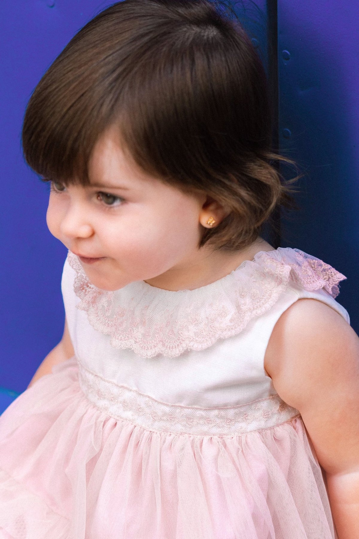 A magical piece for the most special occasions, this dreamy pale pink dress by Mac Ilusión is made for twirls, giggles, and picture-perfect moments. The soft woven bodice features a delicate lace-trimmed neckline, while the layered tulle skirt adds volume and elegance without weighing little ones down. A gentle v-shaped back and double button fastening complete the look, with a cotton-blend lining ensuring all-day comfort. Ideal for birthdays, weddings, and everything in between.