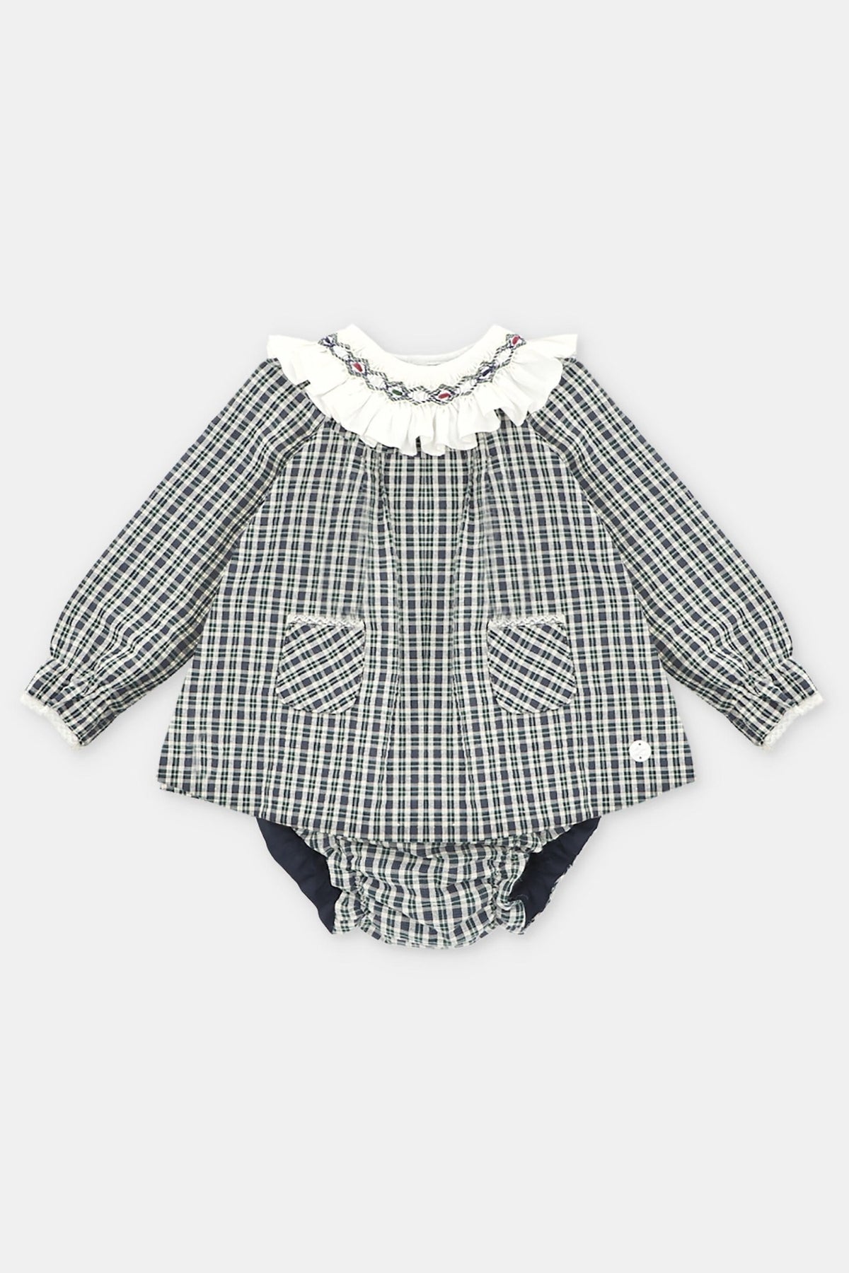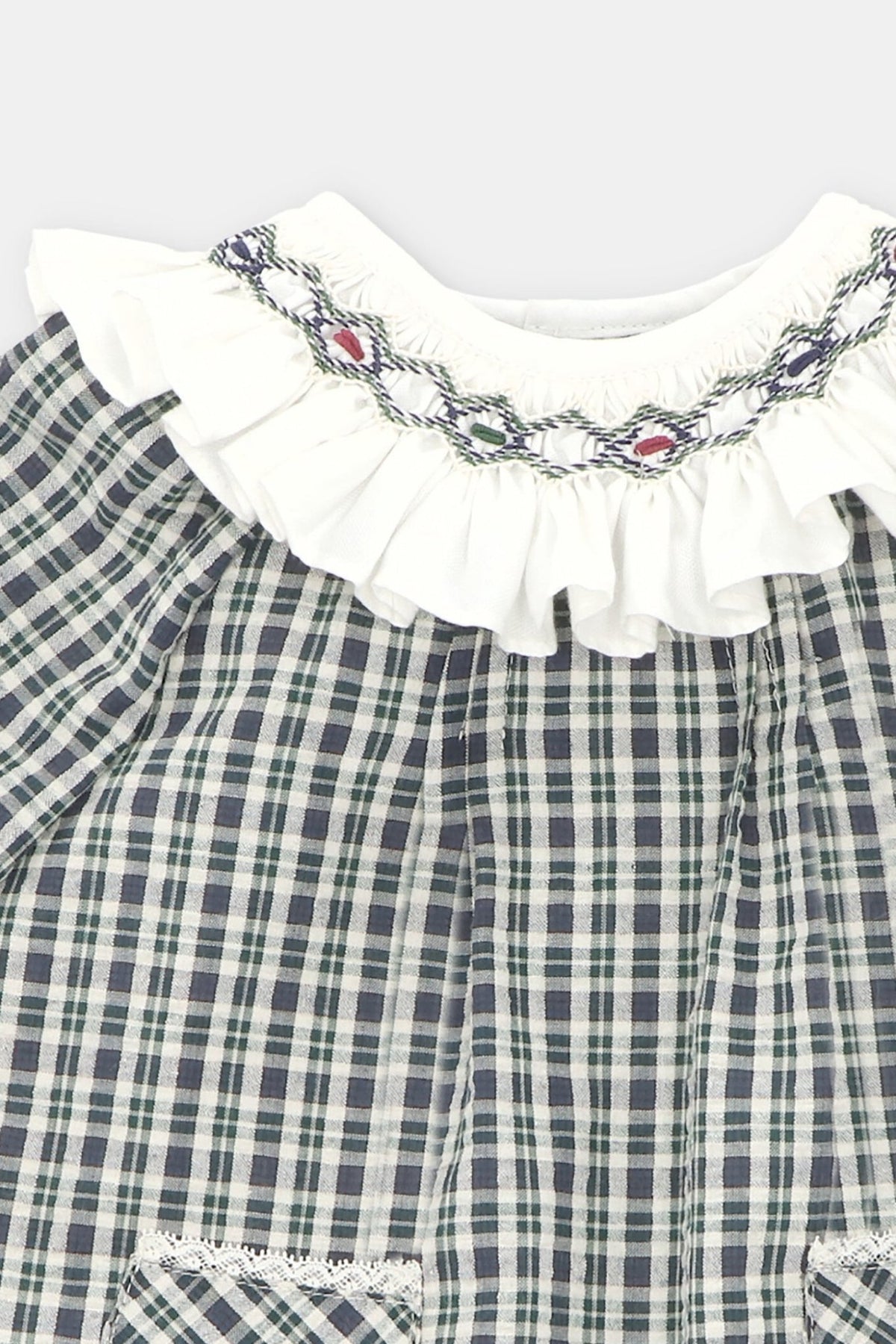 Baby girl's dress from Spanish brand Martín Aranda. Lightweight navy, bottle green and stone tartan seersucker cotton-blend long-sleeve dress with stunning hand-smocked ruffle collar and cutesy pockets trimmed with white lace, paired with matching tartan bloomers.