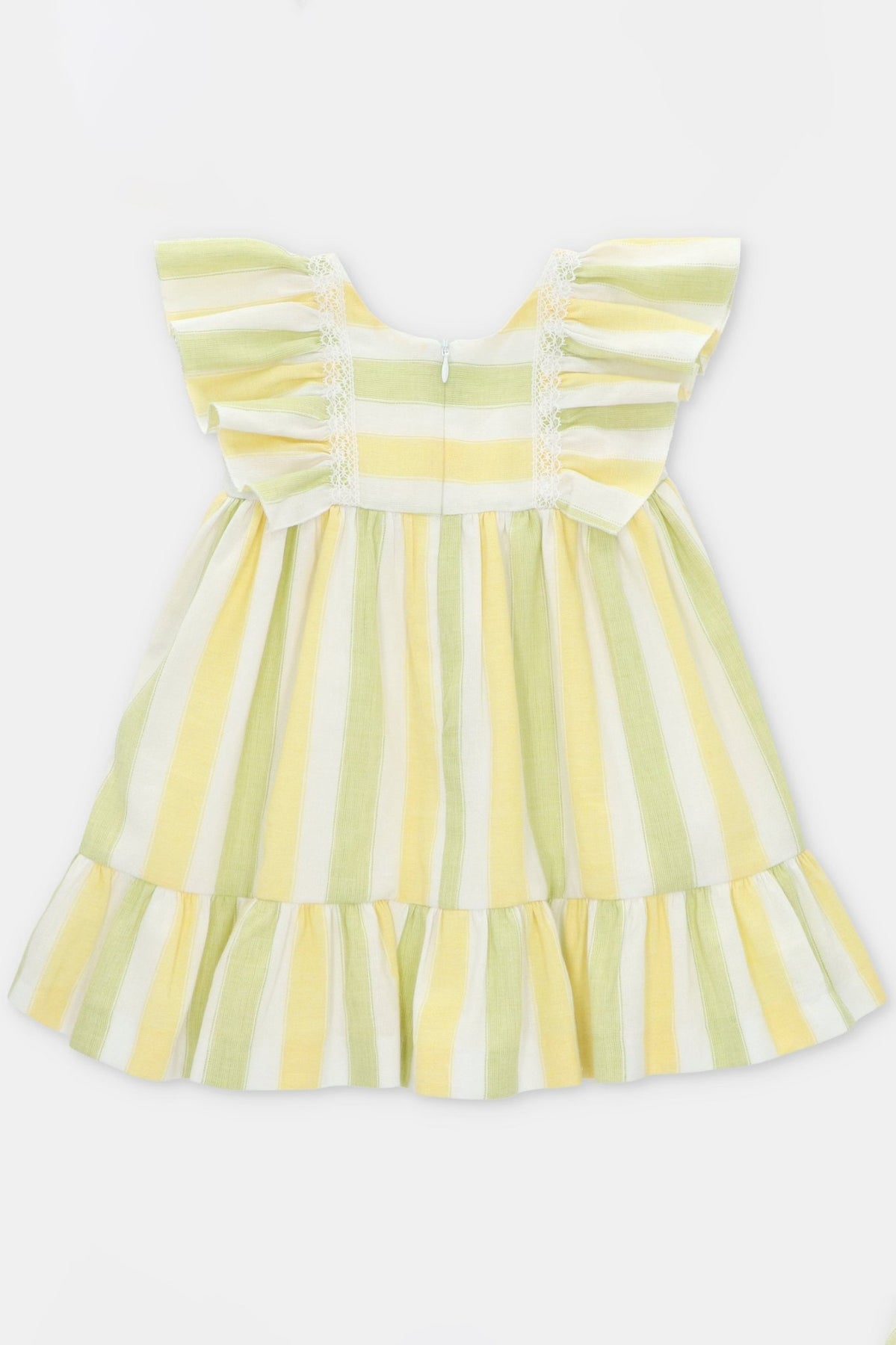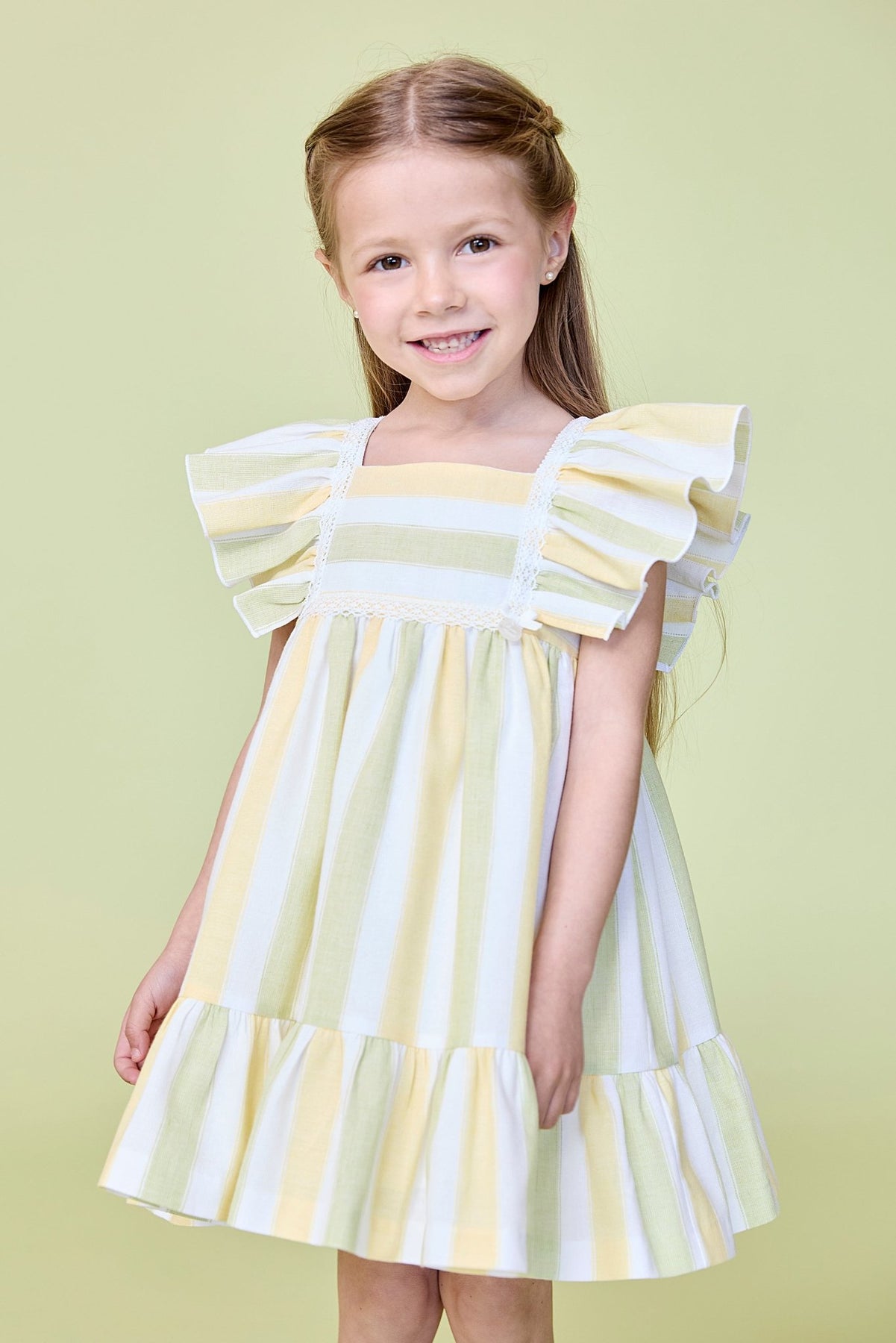 Girl's dress from Martín Aranda. Lightweight lemon, lime and white linen-blend dress with extra large ruffle sleeves, decorated with white lace around the chest and a white grosgrain bow topped with a luxurious mother of pearl branded disc to the waist.