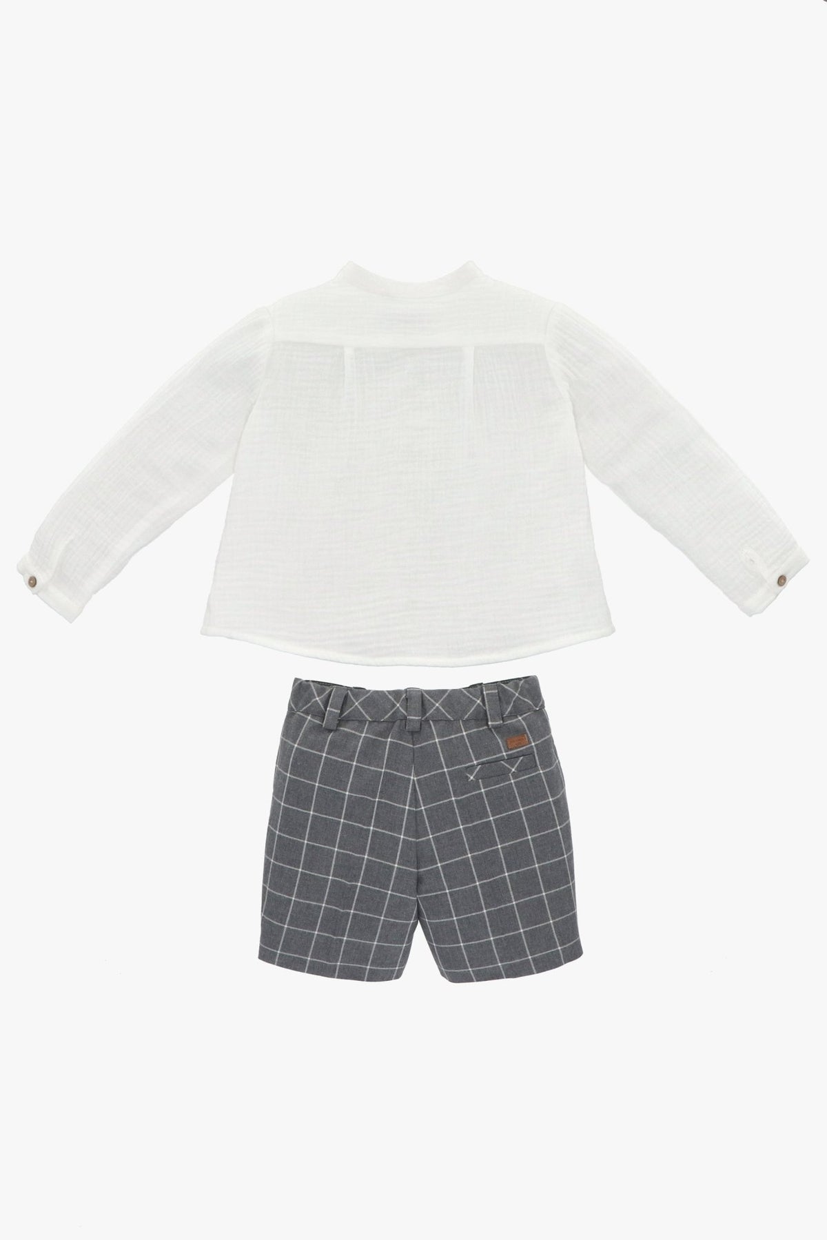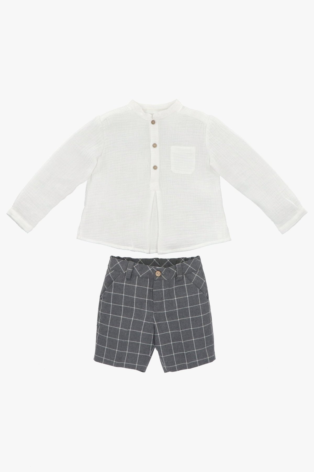 Boy's outfit set from Martín Aranda. Soft, lightweight long sleeve white cheesecloth shirt paired with grey and white checked woven cotton shorts. Finished with a leather branded tab to the back of the shorts.