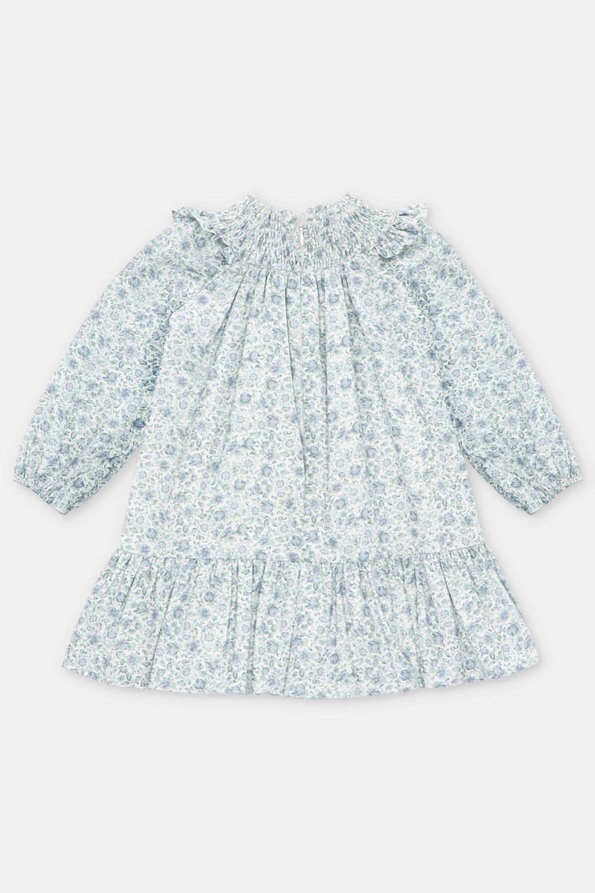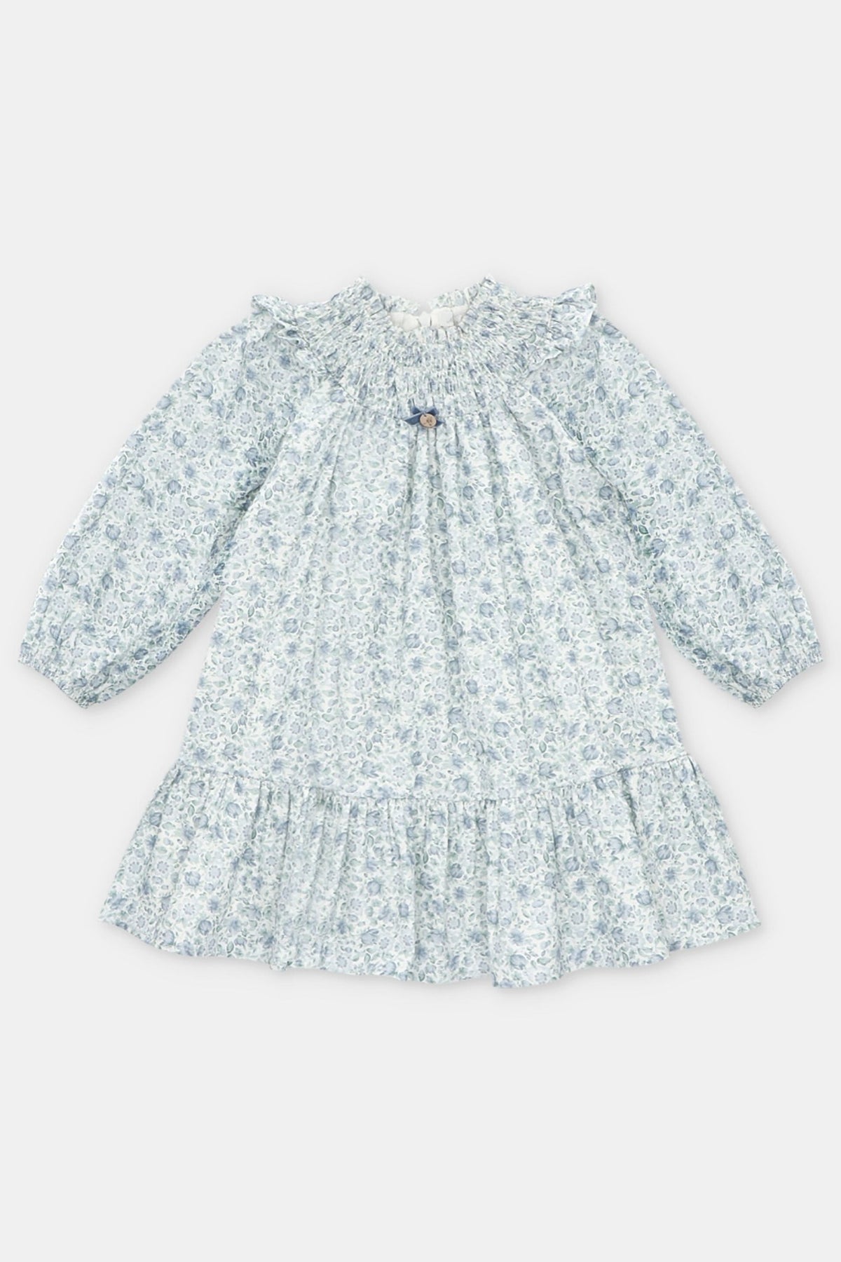 Girl's floral dress from Spanish brand Martín Aranda. Lightweight powder blue vintage floral print long-sleeve dress with shirred neck, decorated a luxurious velvet bow topped with a leather branded disc.