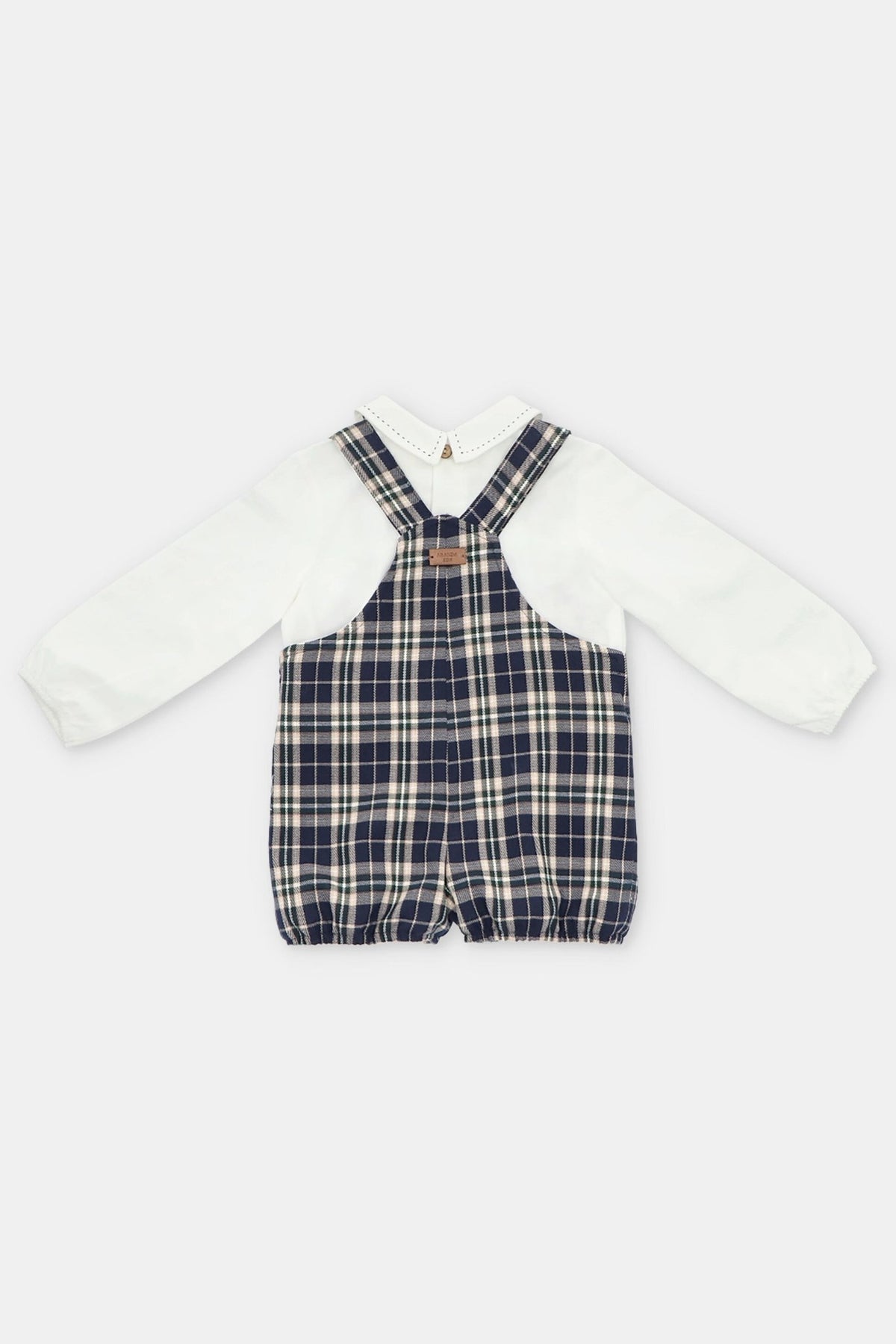 Baby boy's outfit set from Spanish brand Martín Aranda. Lightweight white woven long-sleeve collared shirt with navy stitching to the collar, underneath stylish navy, bottle green and beige tartan patterned dungaree romper.