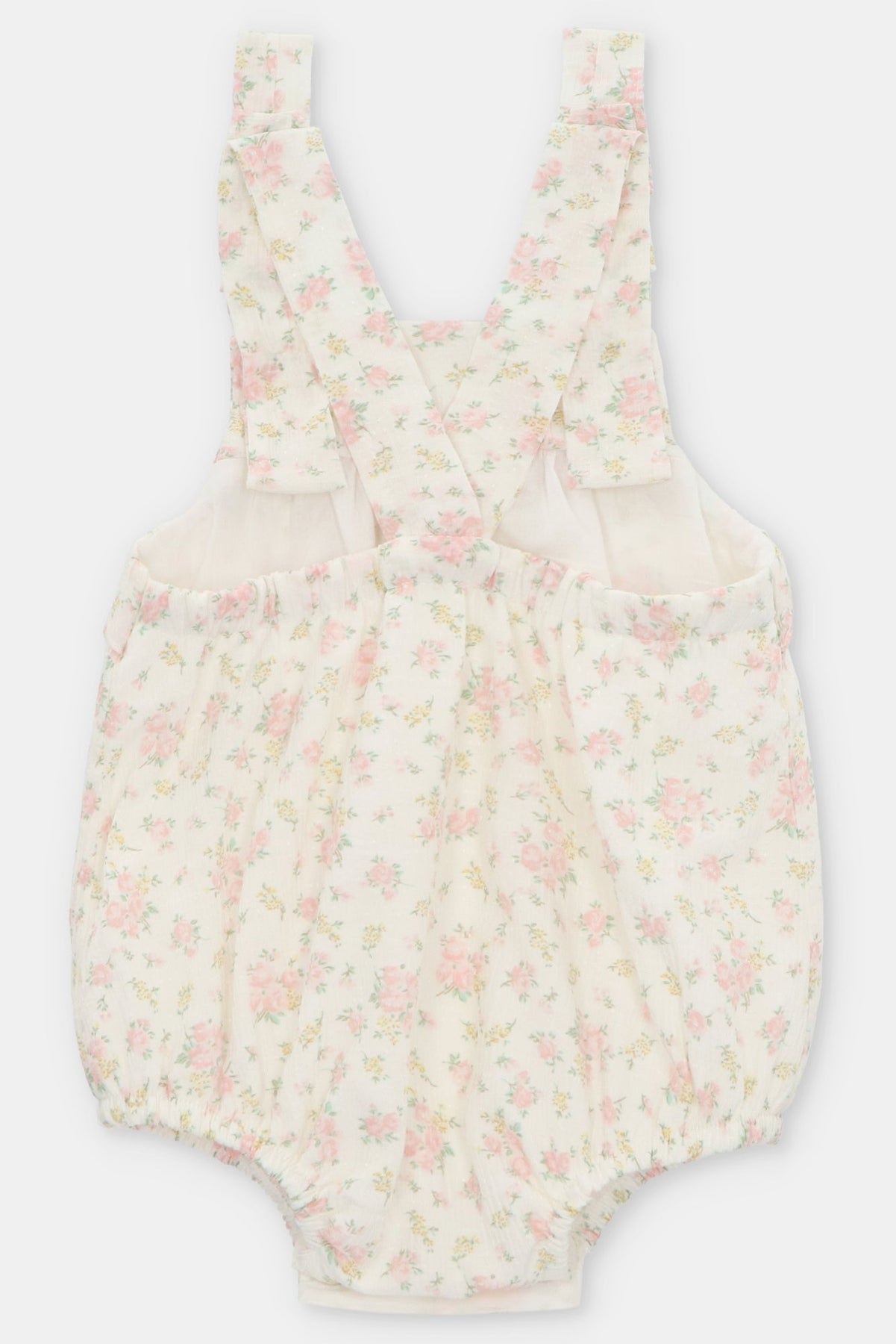 A charming baby girl’s dungaree romper from Martín Aranda crafted from super lightweight floral seersucker fabric, perfect for warm days. Featuring delicate smocking and a ruffle trim at the waist, this piece fastens with mother-of-pearl buttons on the straps and at the crotch for easy dressing. The elasticated waist and legs ensure a comfortable fit, while the soft cotton lining adds an extra layer of comfort.