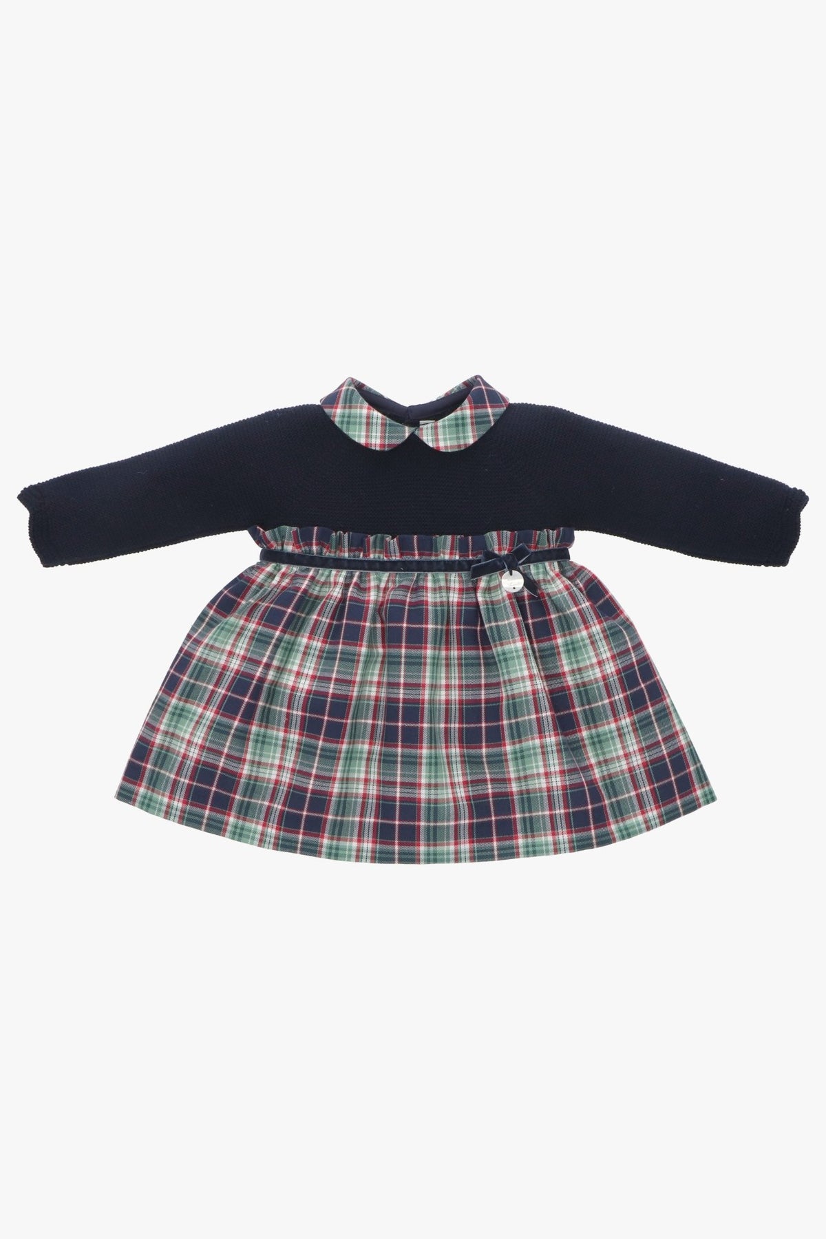Baby girl's half knit dress from Martín Aranda. Soft, lightweight knit long sleeve navy dress with festive bottle green tartan collar and skirt, decorated with a navy blue ribbon around the waist, topped with a luxurious mother of pearl branded disc. Luxurious mother of pearl button fastening all way down back for easy dressing. Skirt is lined.