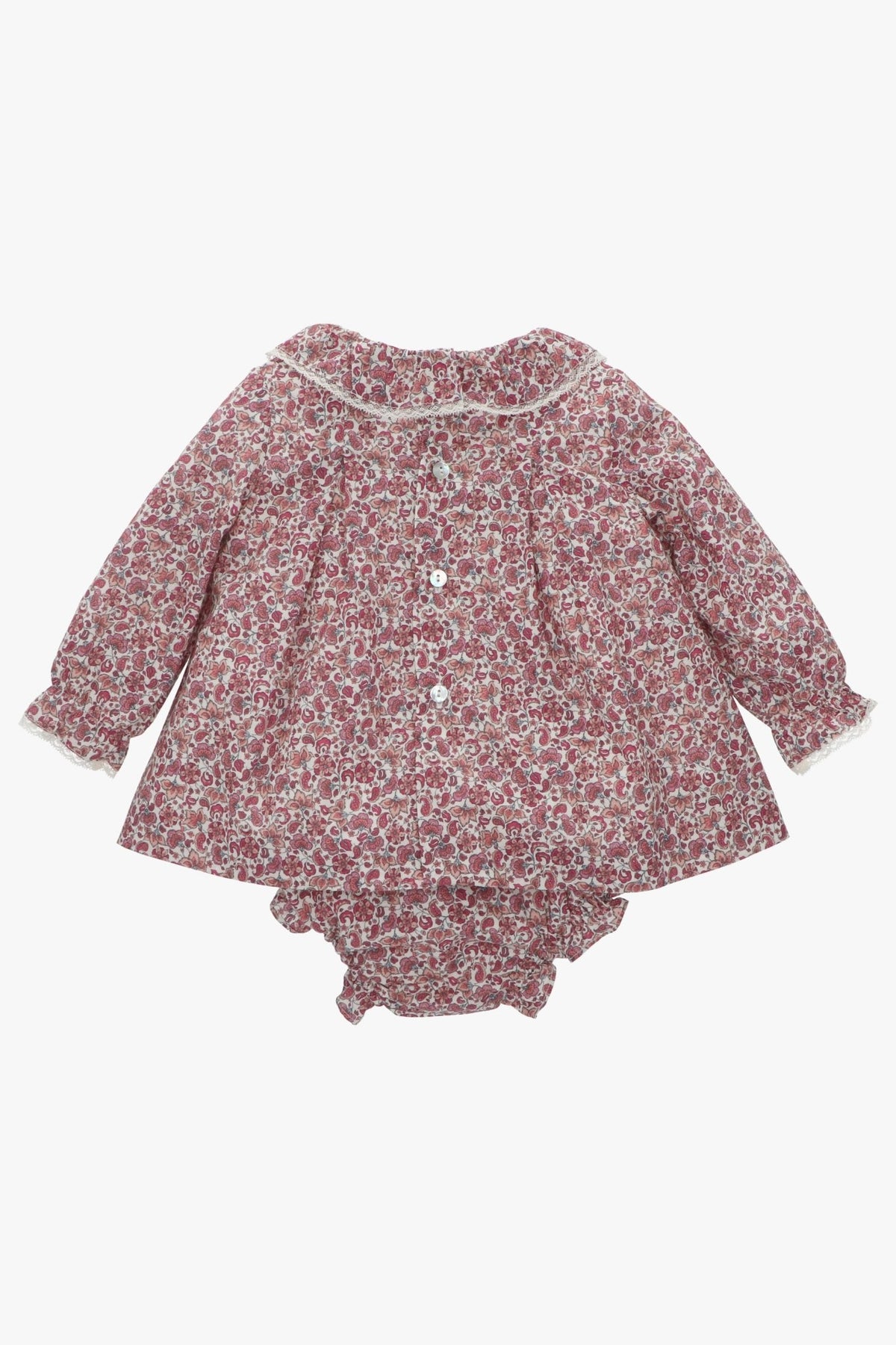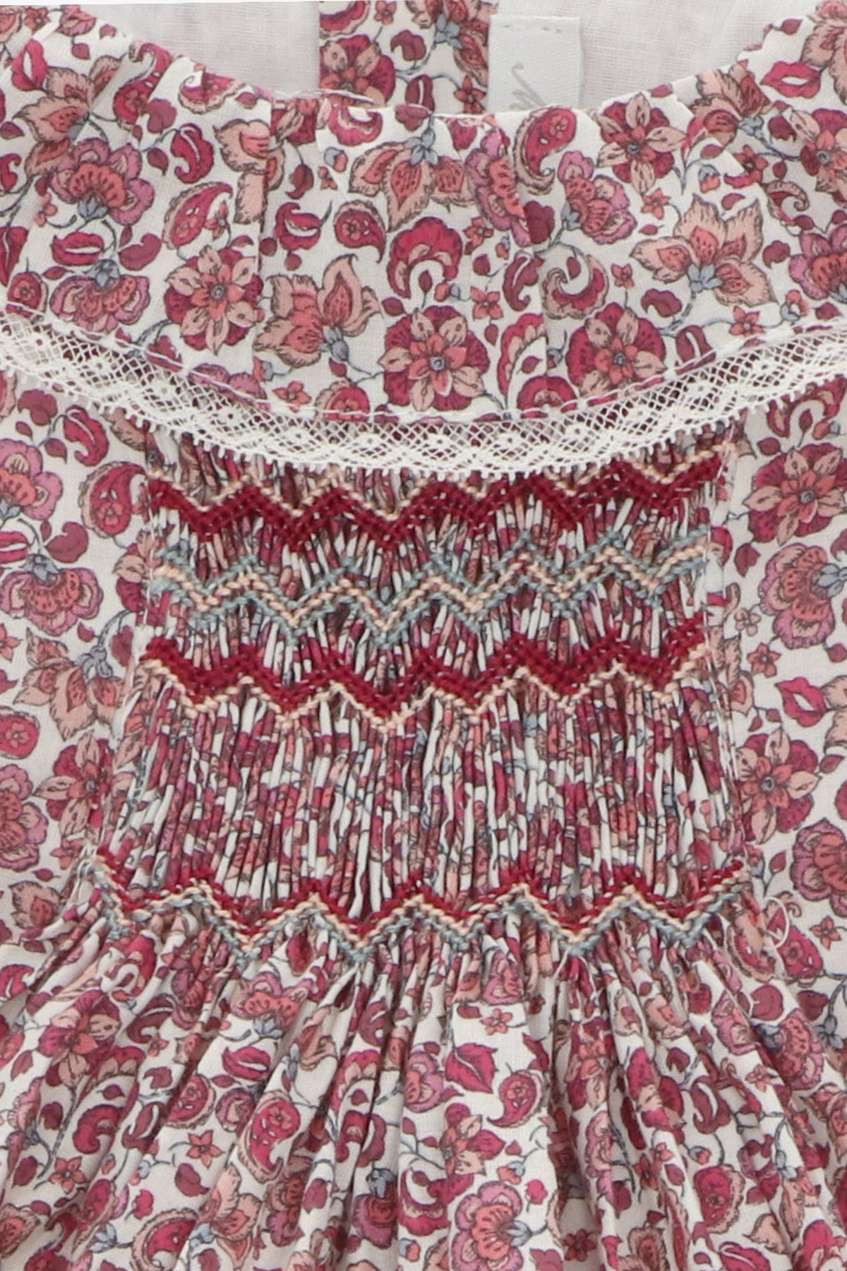 Lightweight burgundy vintage floral long sleeve with lace trimmed ruffle collar and sleeves and stunning hand smocking to the bodice. Decorated with a luxurious mother of pearl branded disc. Outfit is completed with matching floral bloomers.