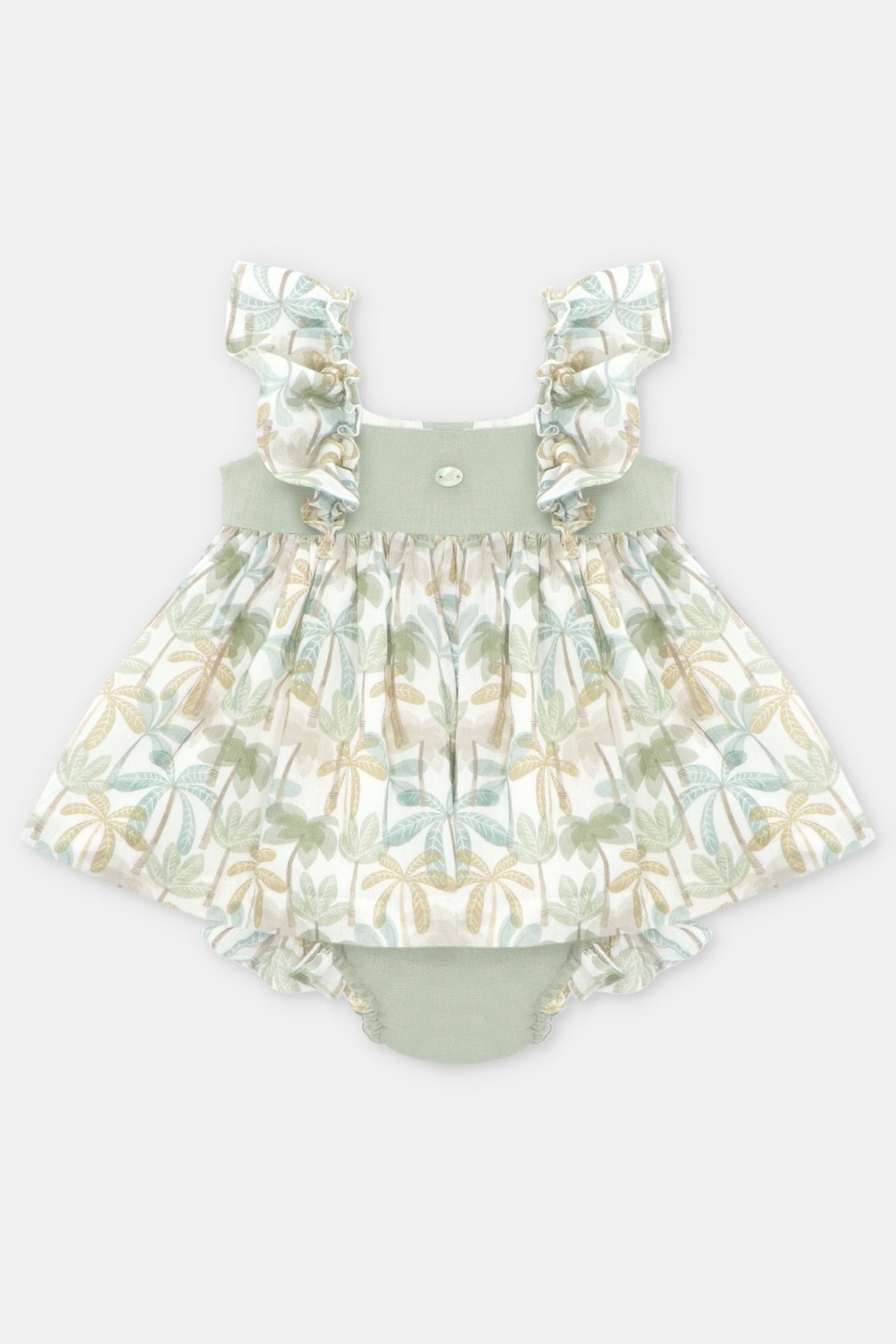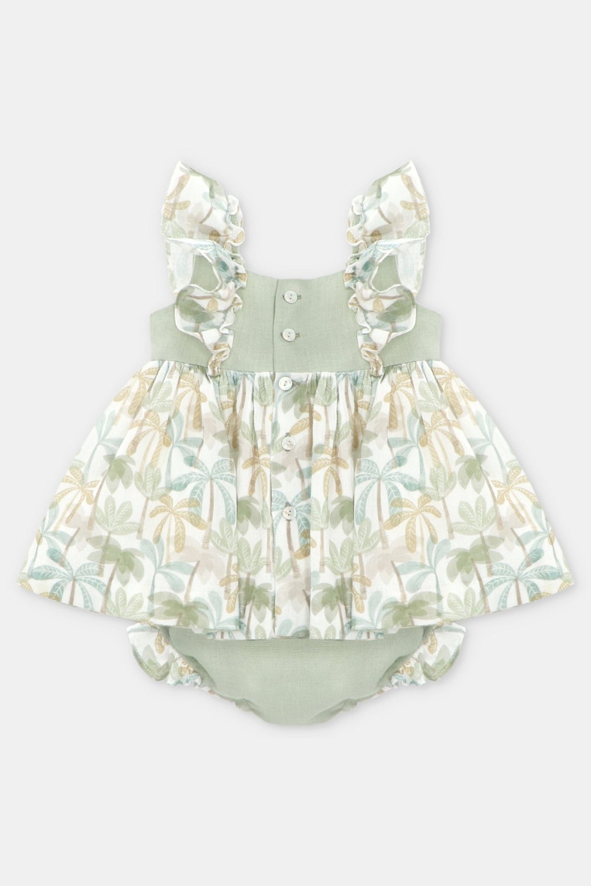 A breezy and elegant baby girl’s dress and bloomers set from Martín Aranda, perfect for warm days. The super lightweight seersucker dress features a soft palm tree print, delicate ruffle sleeves, and a sage green linen bodice for a charming touch. Fastens with natural mother-of-pearl buttons down the back. The matching sage green linen bloomers are fully lined, with an elasticated waist and legs for a comfortable fit.