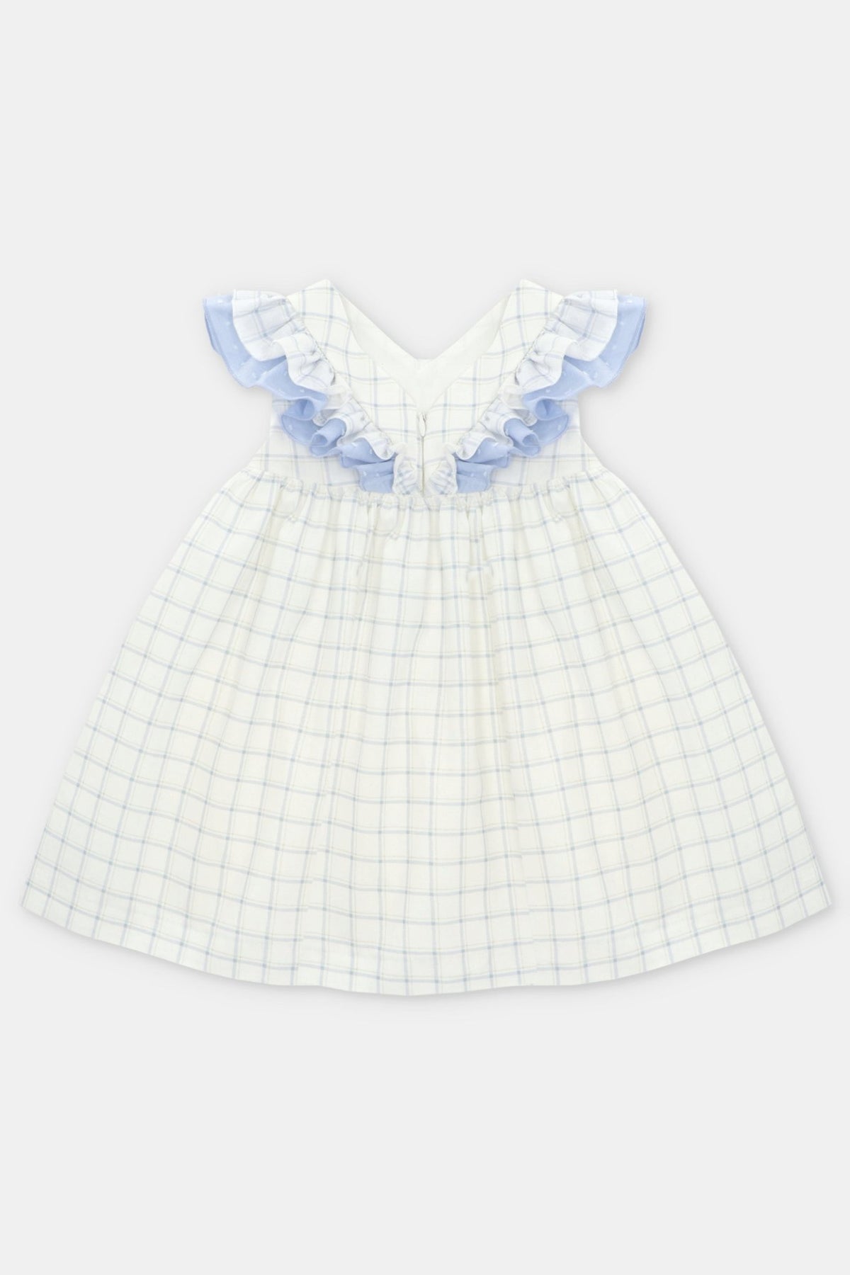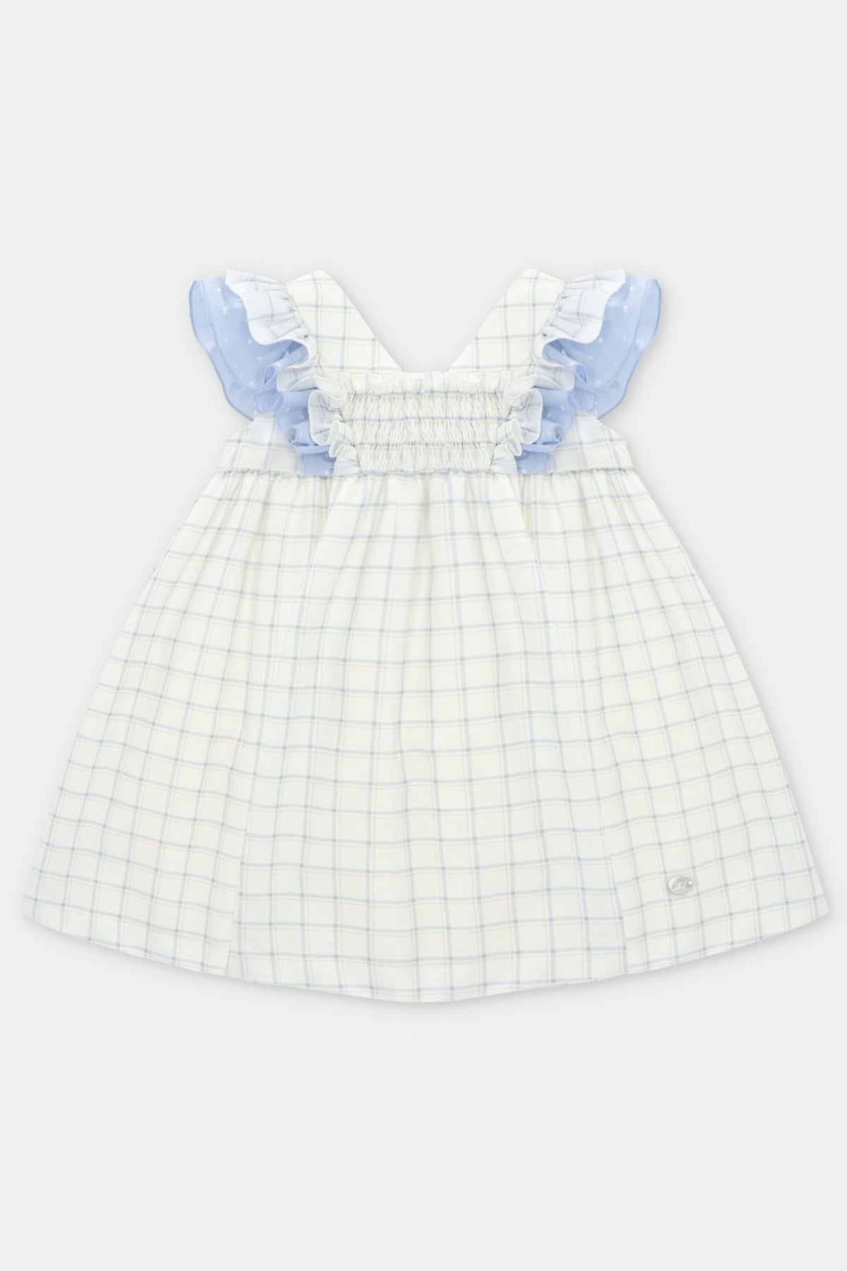 A beautifully delicate dress for older girls from Martín Aranda, featuring a white and sky blue checkered design with a shirred bodice for a comfortable, flattering fit. The layered ruffle sleeves add a touch of charm, with one layer crafted from soft plumeti dot cotton for extra detail. A gentle V-shaped back and zip fastening complete this timeless piece, fully lined for comfort.