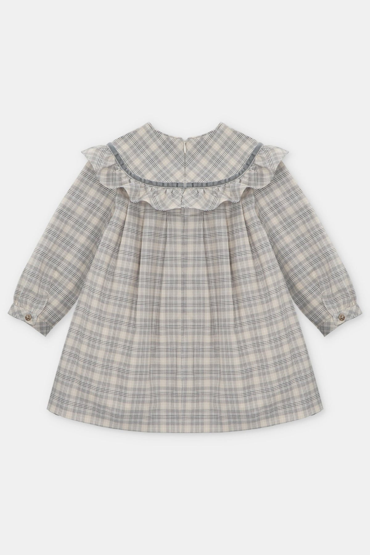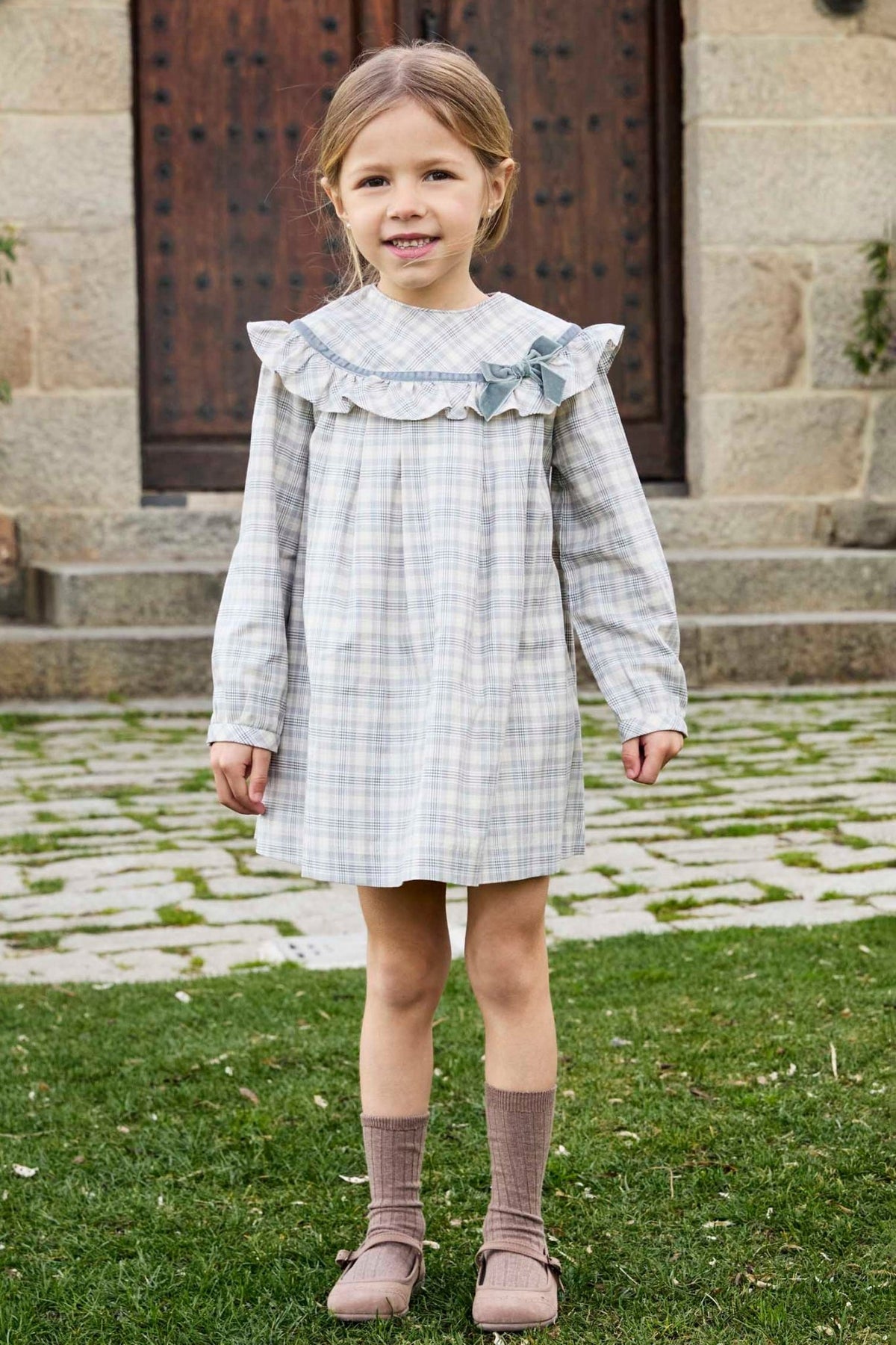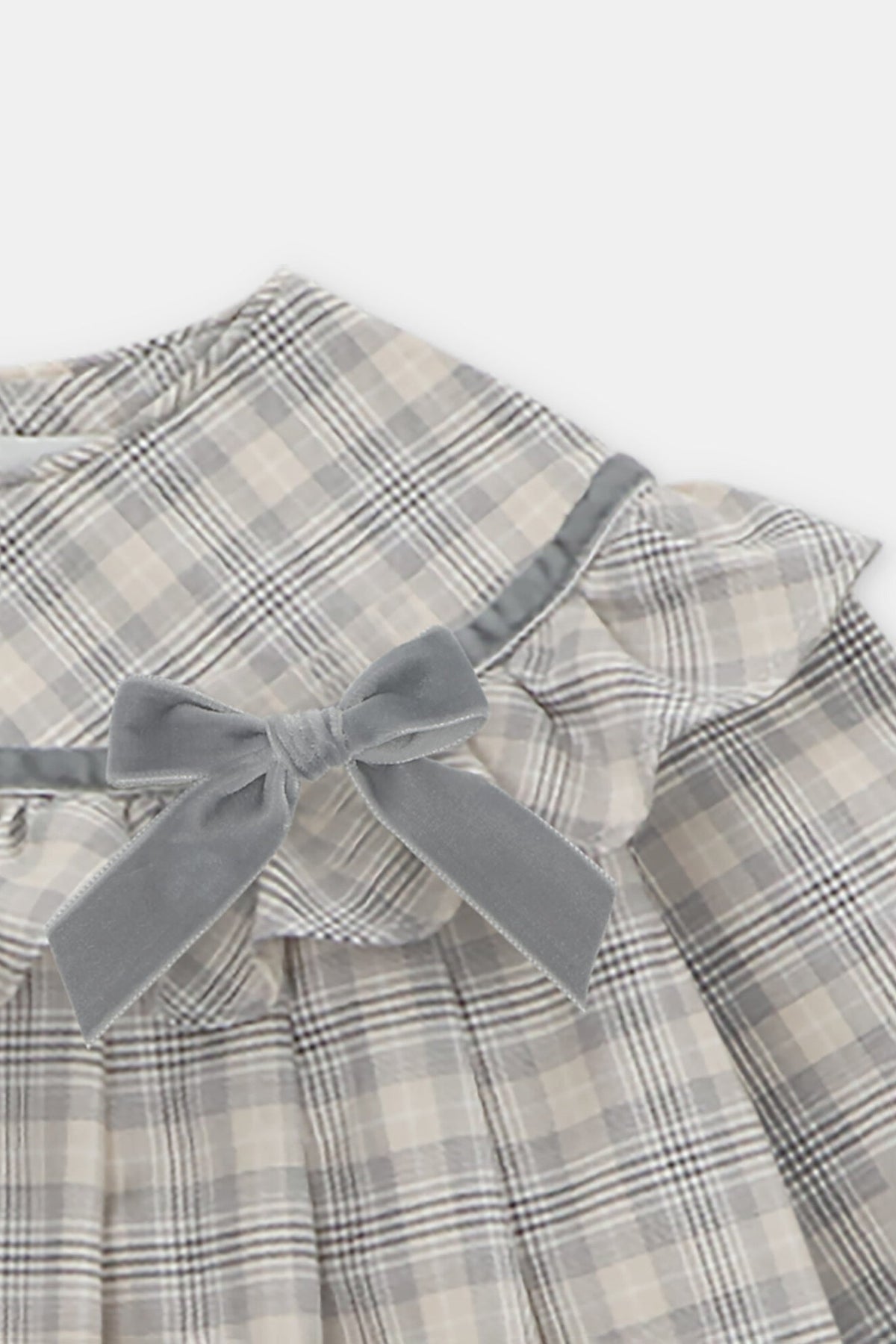 Girl's tartan dress from Spanish brand Martín Aranda. Super lightweight stone tartan-patterned long-sleeve dress with frill around the chest and shoulders, decorated with a luxurious grey velvet ribbon topped with a velvet bow.