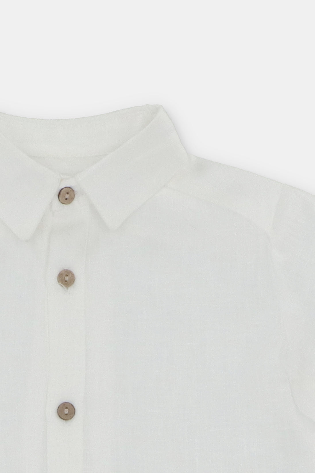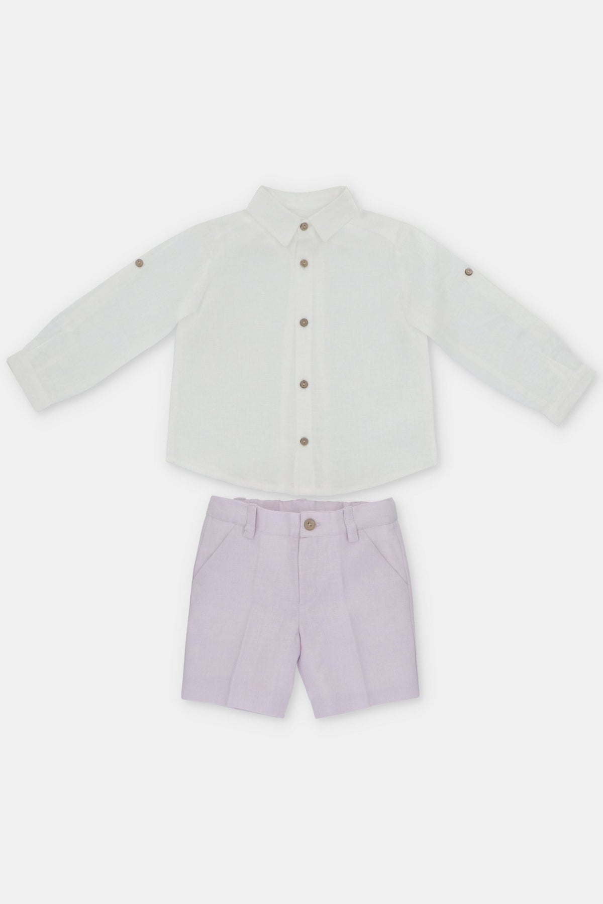 Boy's traditional outfit set from Martín Aranda. Lightweight white linen long sleeve button-down shirt paired with summery lavender-coloured linen shorts with sophisticated brown leather branded tab to the back.