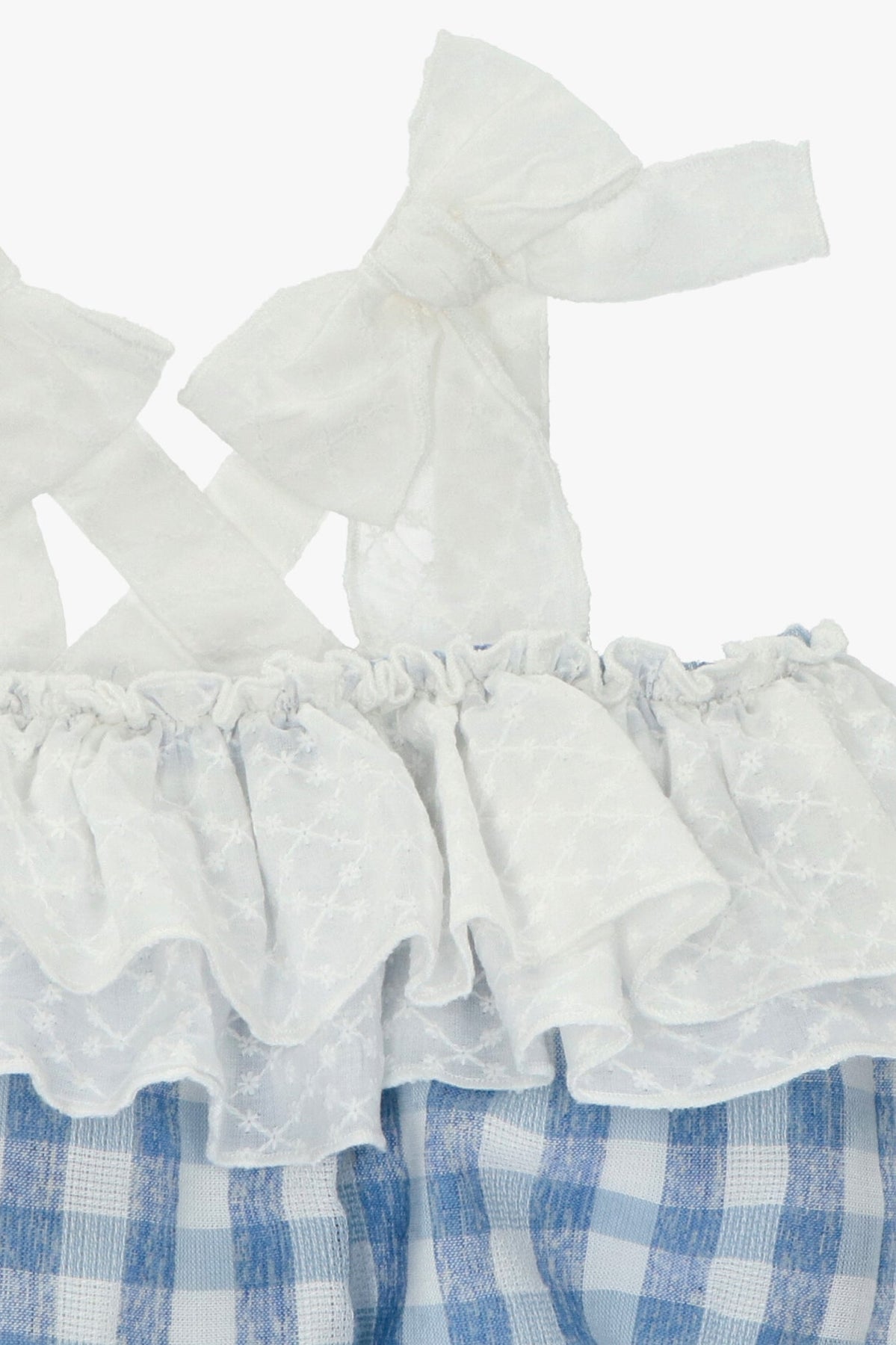 Baby girl's french blue shortie from Spanish designer Martín Aranda. French blue and white gingham shortie with white broderie anglaise straps and frills around the chest, made from a soft, lightweight, breathable cotton blend. Finished with a white broderie anglaise bow to each shoulder.