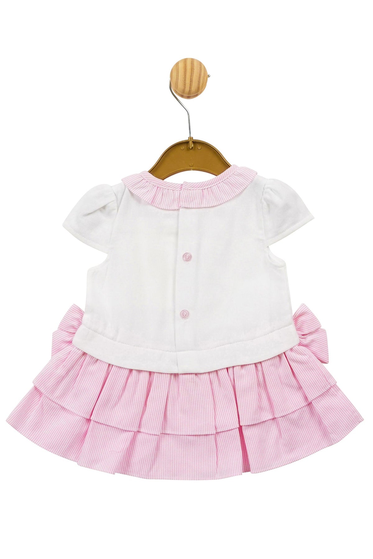 Girl's striped dress from British brand Mintini Baby's Spring/Summer '24 collection. Soft white short sleeve drop waist dress with pink striped ruffle collar and layered skirt, decorated with a lemon bow topped with a mother of pearl branded heart to the chest, and two bows to the waist.