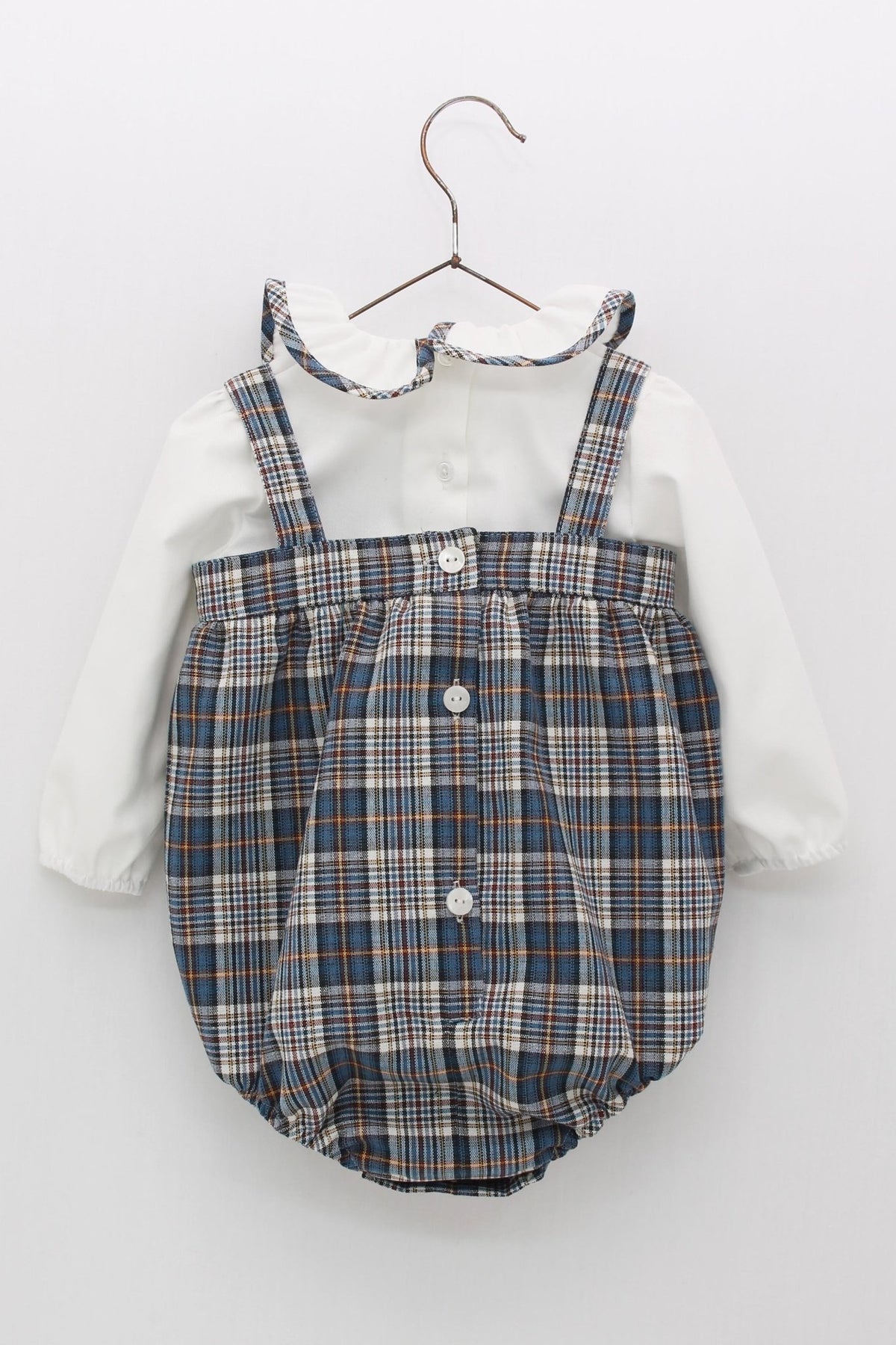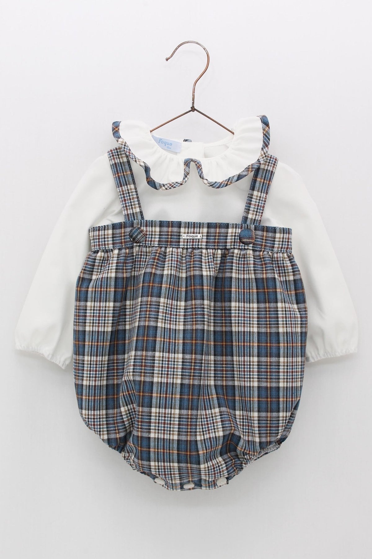 Baby boy's romper from Spanish brand Foque. Petrol blue tartan faux dungaree-style romper with faux white long sleeve ruffle collared shirt. Finished with two fabric covered buttons.