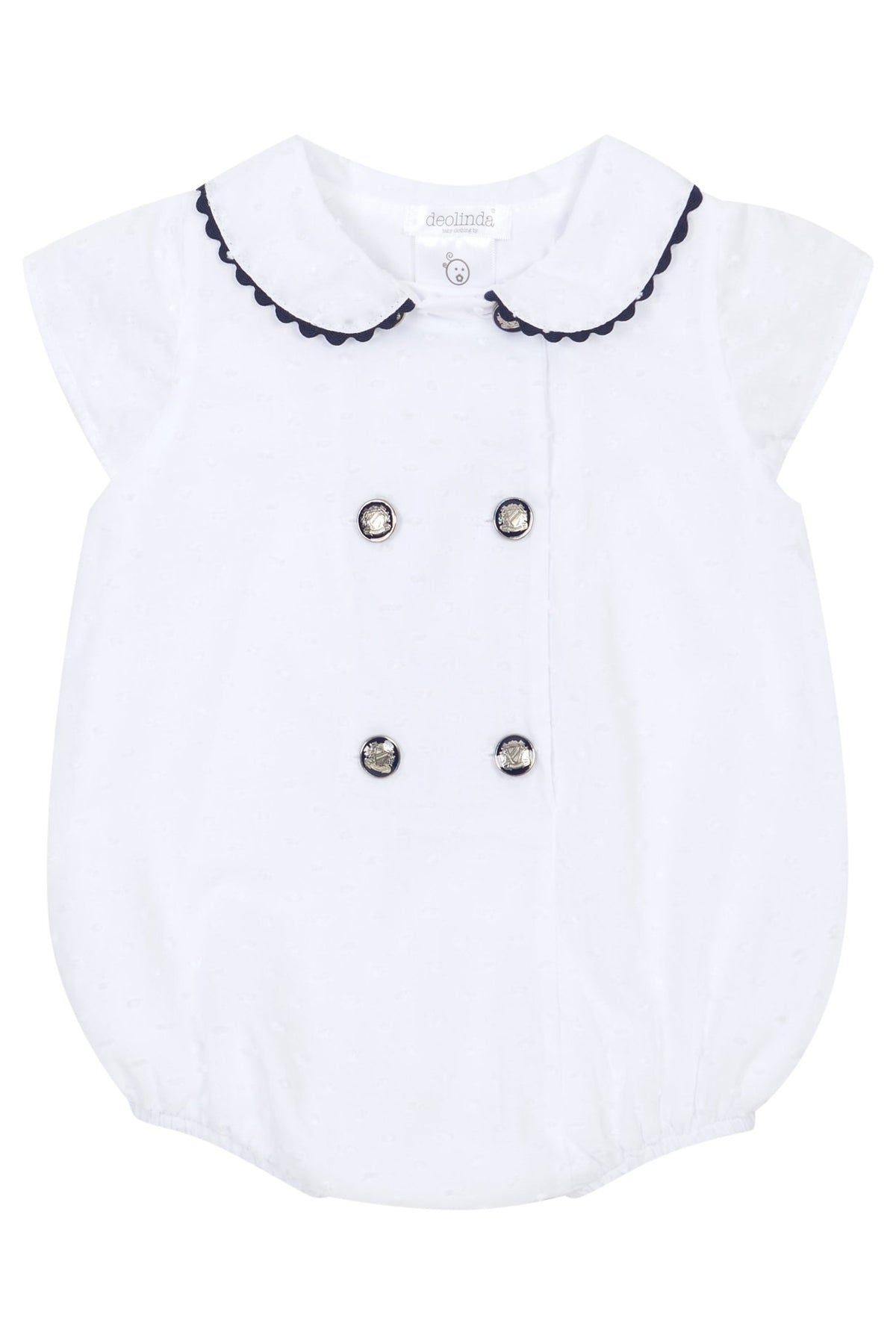 Unisex baby's romper from Portuguese brand Chic by Deolinda. Let your little one sail confidently into summertime fun with this lightweight, white plumeti dot romper! Short-sleeved and adorned with a pop of colour with the navy ricrac trim, it's also accented by charming navy and silver nautical buttons.