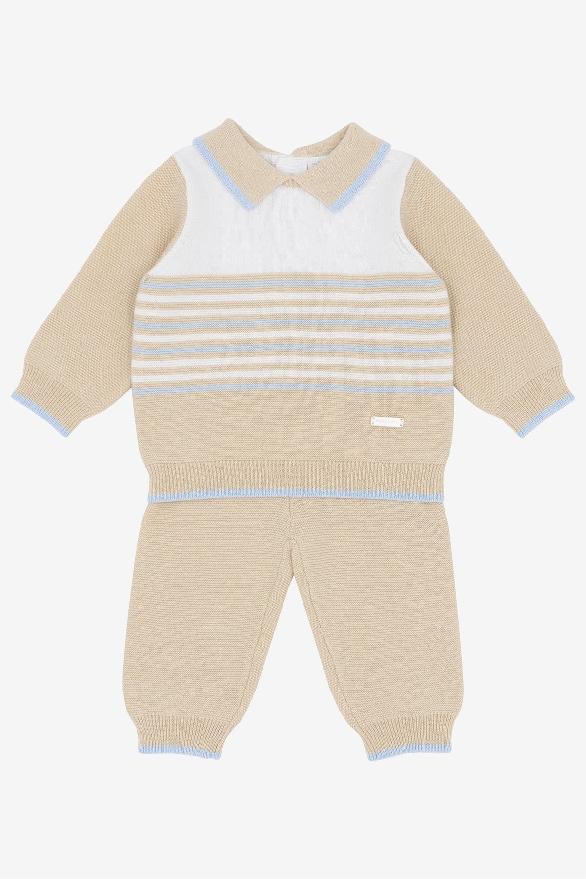 "Mason" Beige, White & Blue Knitted Polo Top & Trousers