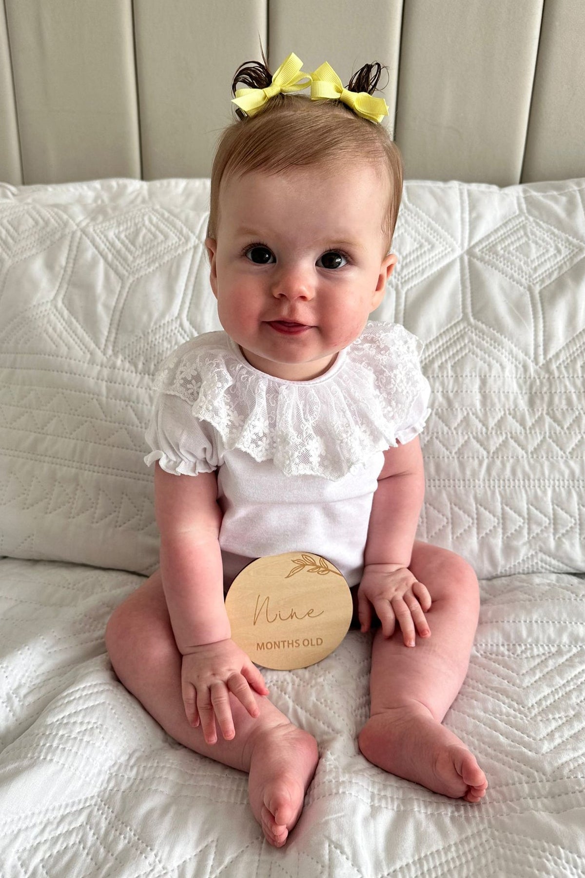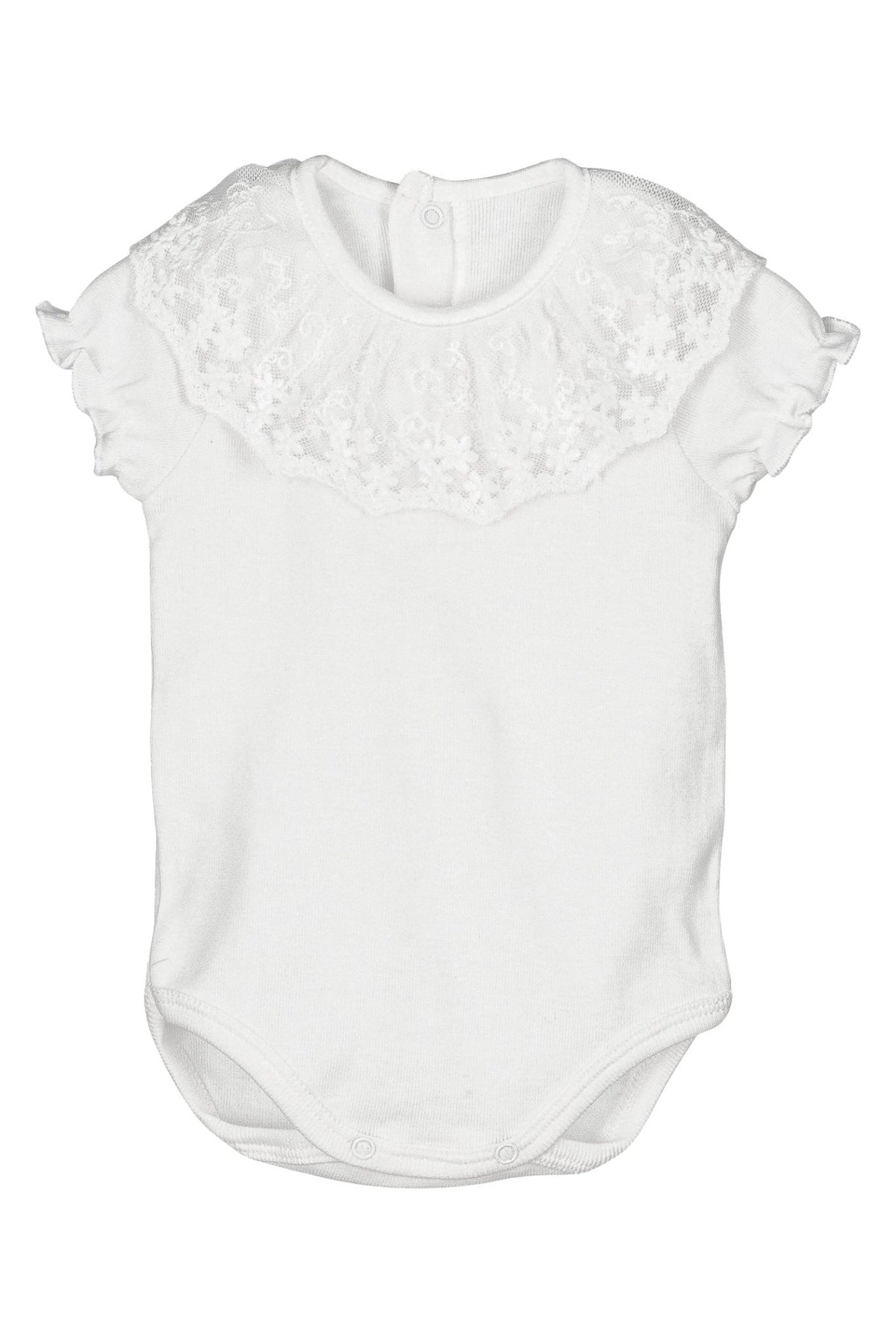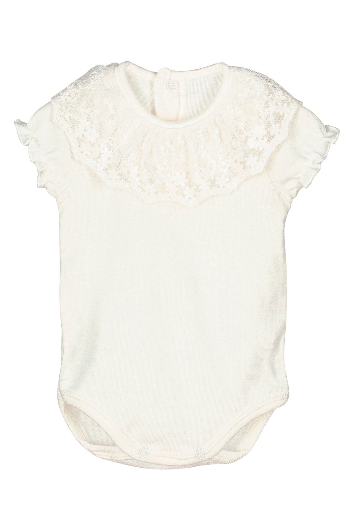 Short sleeve bodysuit with beautiful lace ruffle collar from Spanish brand Calamaro. Choose from White or Cream.