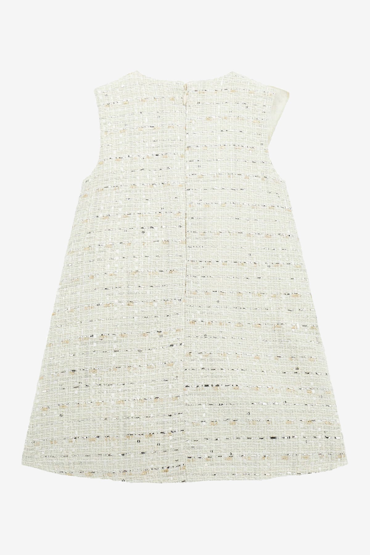 A dress made for golden moments. This beautiful sleeveless tweed dress from GUESS® Kids shimmers softly in cream, silver, and gold tones – perfect for celebrations and special occasions. The ruffle trim sweeps gracefully across the front, while the subtle sparkle in the fabric catches the light with every twirl. A gold engraved heart sits at the chest for that unmistakable GUESS® touch. Fully lined for comfort, this dress is where classic charm meets modern elegance – a little showstopper for your little one.