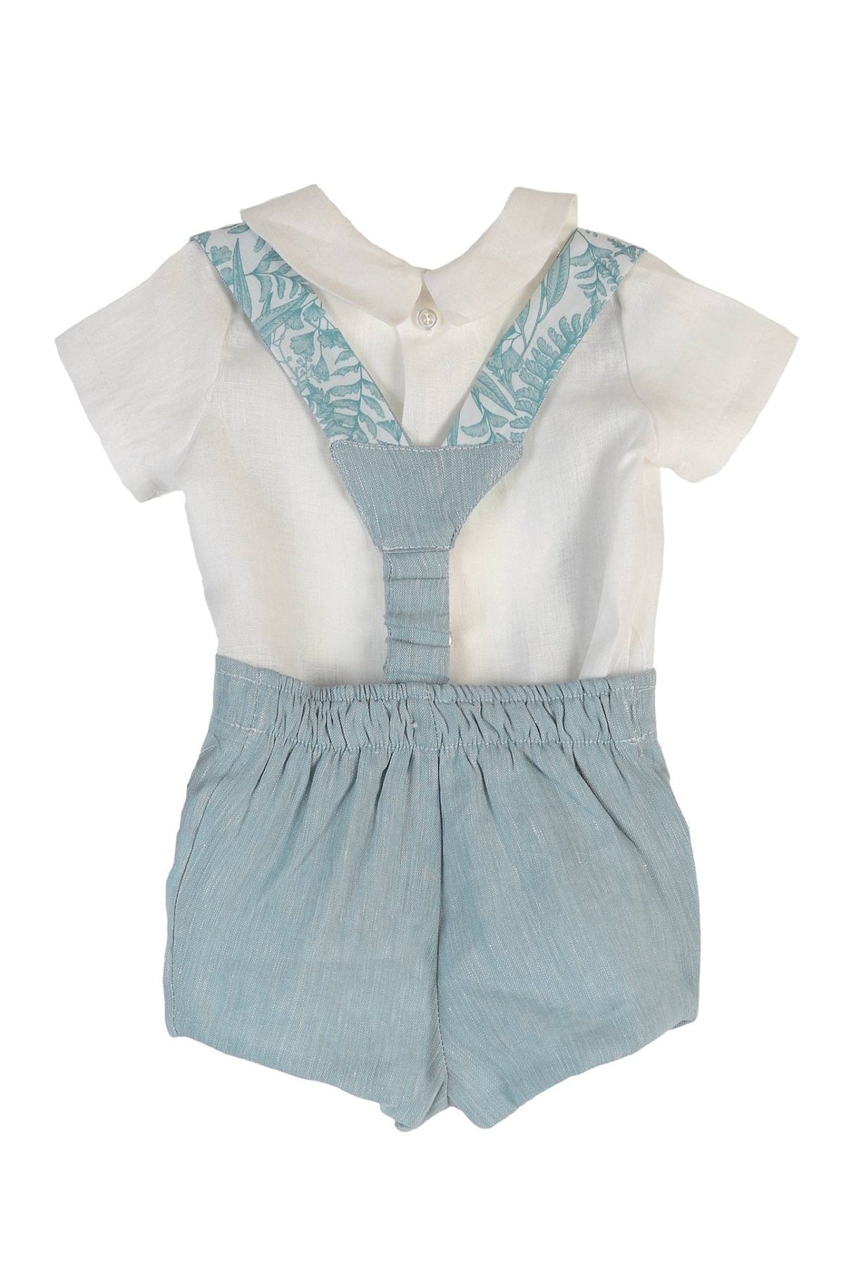 Baby boy's traditional-style outfit set from Spanish brand Tartaleta. Lightweight ivory short sleeve collared shirt underneath light teal linen-blend shorts with stylish teal leaf print removable braces with elasticated back.