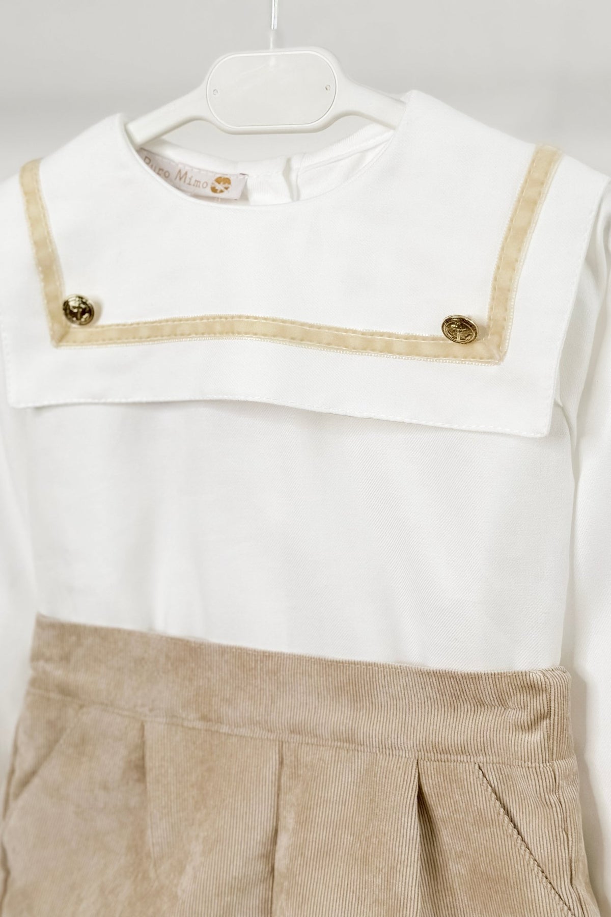Classic and effortlessly smart, this Puro Mimo outfit set is made for little gentlemen with timeless taste. The crisp white piqué shirt, detailed with a velvet-trimmed sailor collar and gold-tone buttons, pairs perfectly with soft stone needlecord shorts for a look that’s both traditional and cosy. The shorts are fully lined and feature an adjustable elasticated waist, ensuring the perfect fit as your little one grows. Thoughtfully designed for comfort and finished with pearlised buttons down the back, it’s a timeless outfit made for autumn adventures and cherished memories.