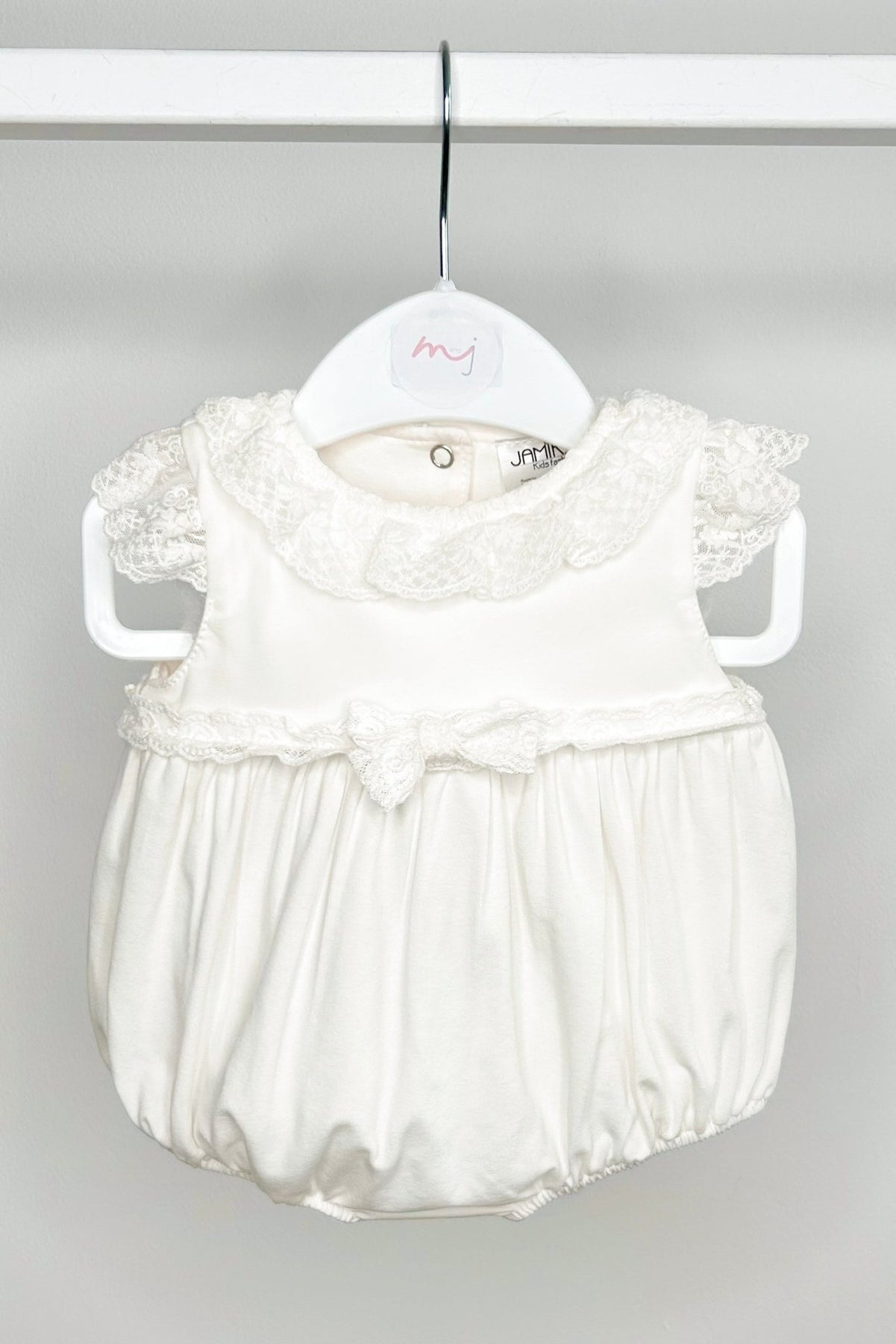Elegance meets everyday comfort in this ivory Jamiks romper, perfect for special summer days. With delicate lace flutter sleeves, a scalloped collar, and an airy net overlay on the bodice, it’s finished with a dainty lace bow at the waist for a timeless, vintage-inspired feel. The soft elasticated legs and back-and-crutch popper fastening ensure ease of movement and quick changes, making it as practical as it is beautiful.