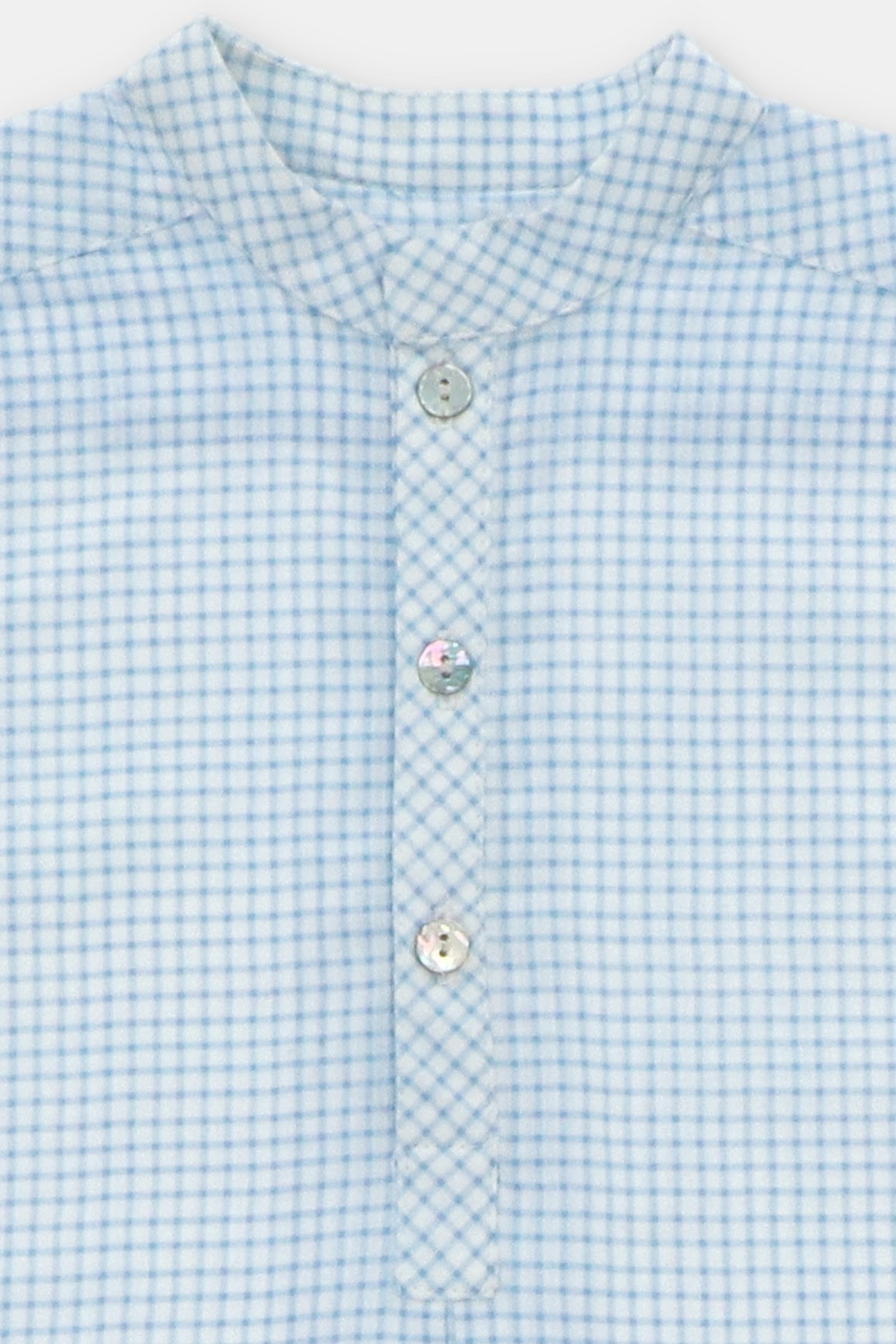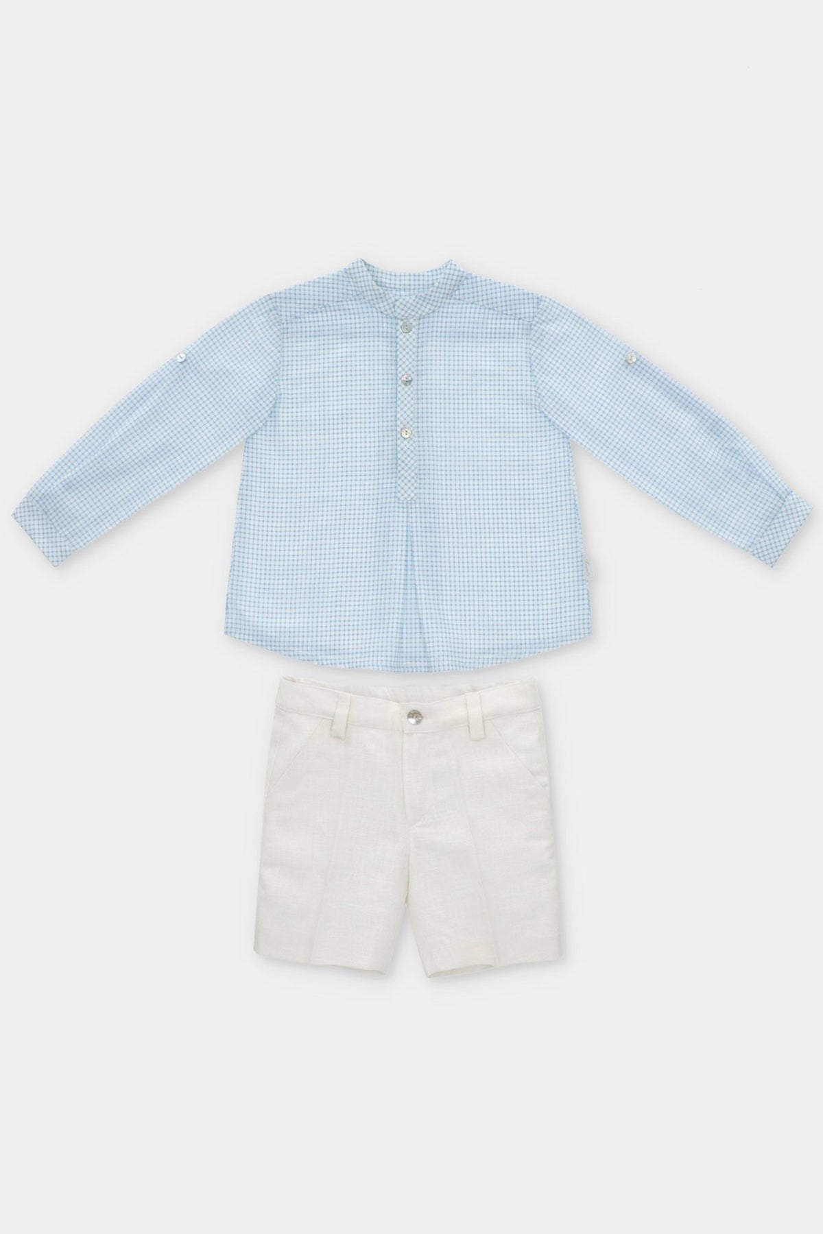 Boy's smart outfit set from Martín Aranda. Lightweight dusky blue checked long sleeve shirt paired with fresh white shorts with sophisticated brown leather branded tab to the back.