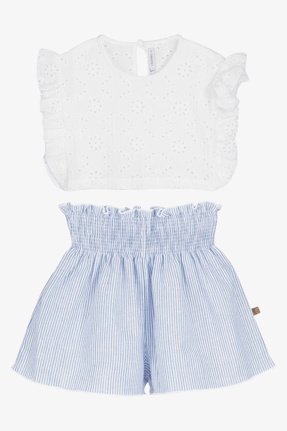 "Dottie" White Broderie Anglaise Top & Blue Striped Shorts