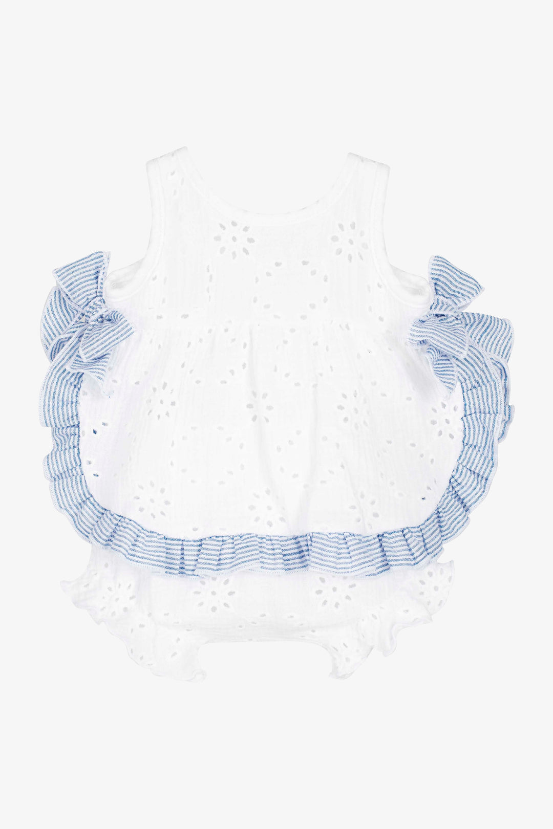 "Willa" White Broderie Anglaise Top & Blue Striped Bloomers