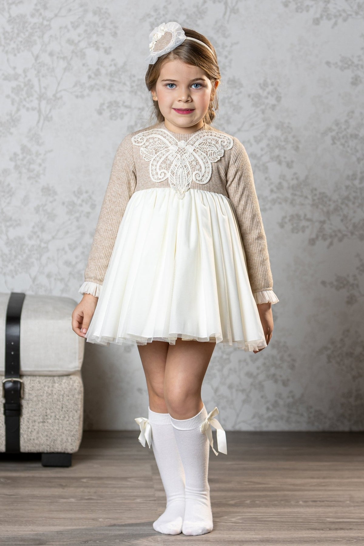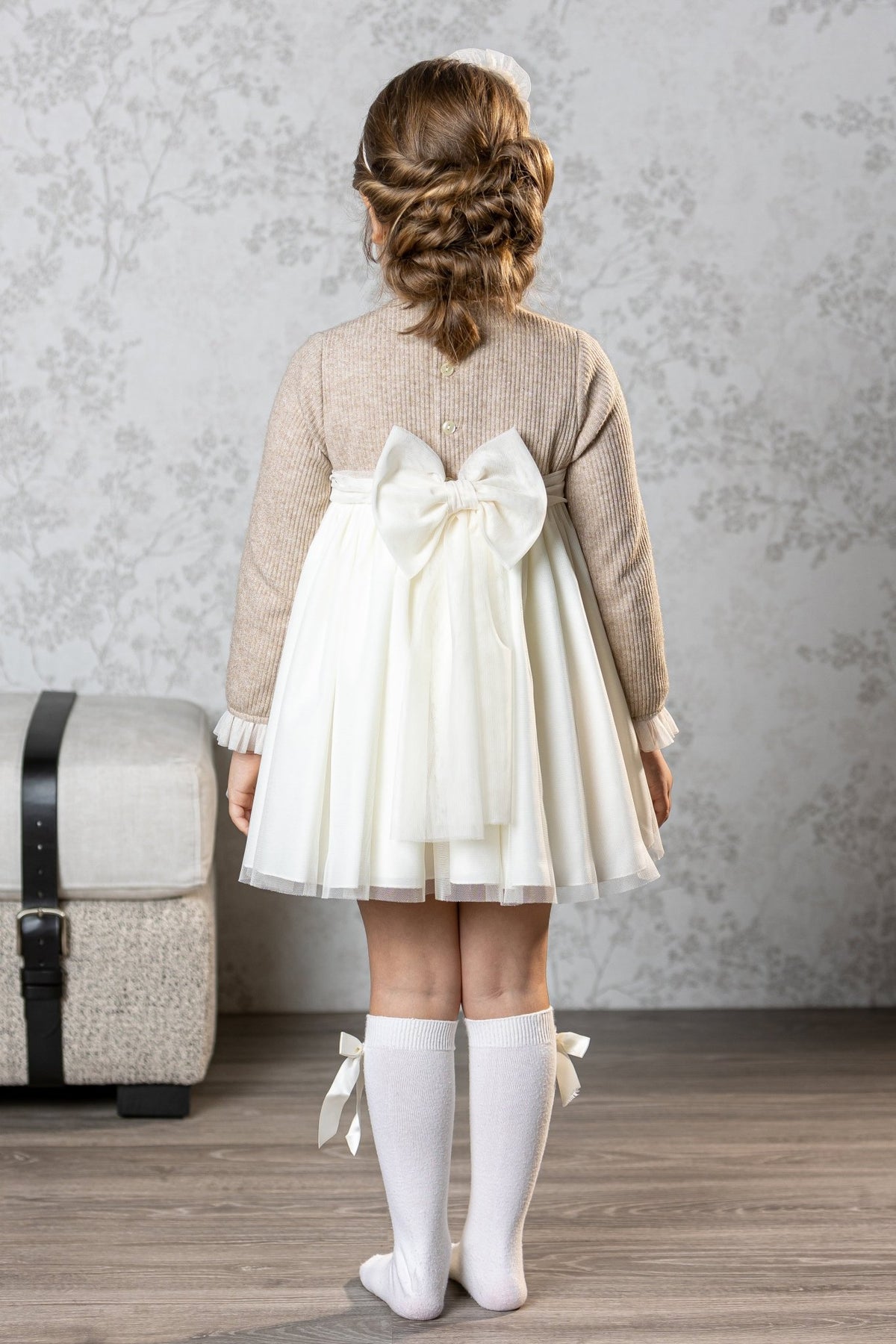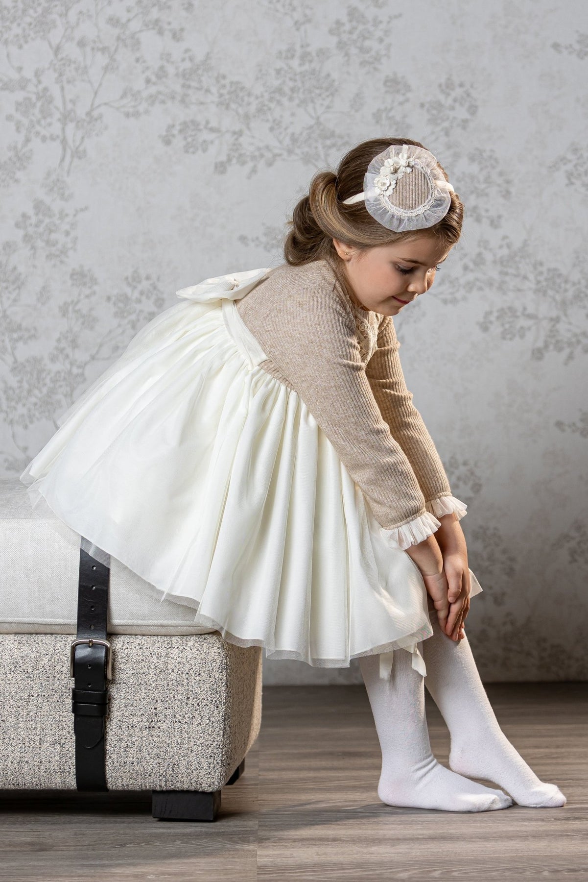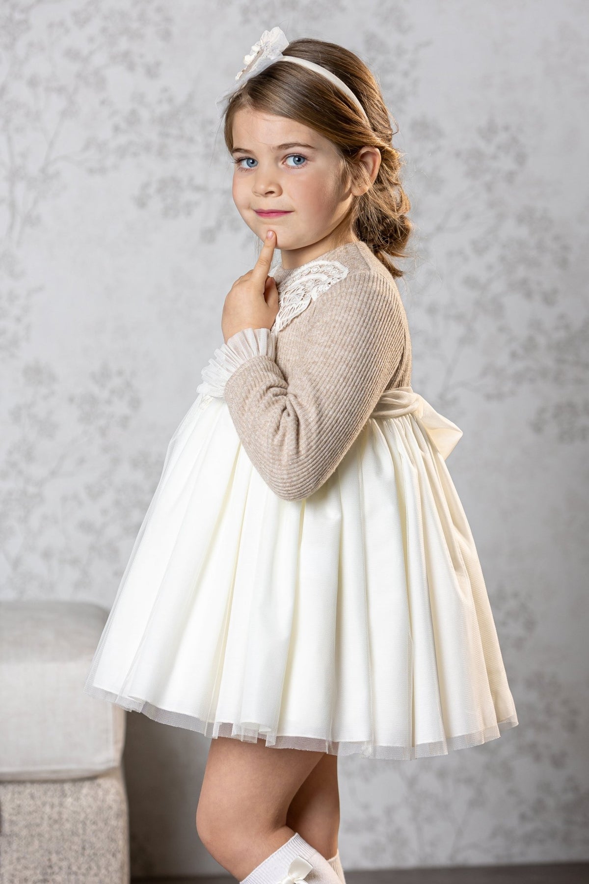 Girl's traditional Spanish-style dress from Spanish brand Abuela Tata. Lightweight, soft, long-sleeve sparkly beige knit dress with girly ivory layered tulle skirt, finished with ivory tulle ruffles to the sleeves, a pretty cream lace butterfly motif to the chest and an extra large ivory tulle bow to the back.