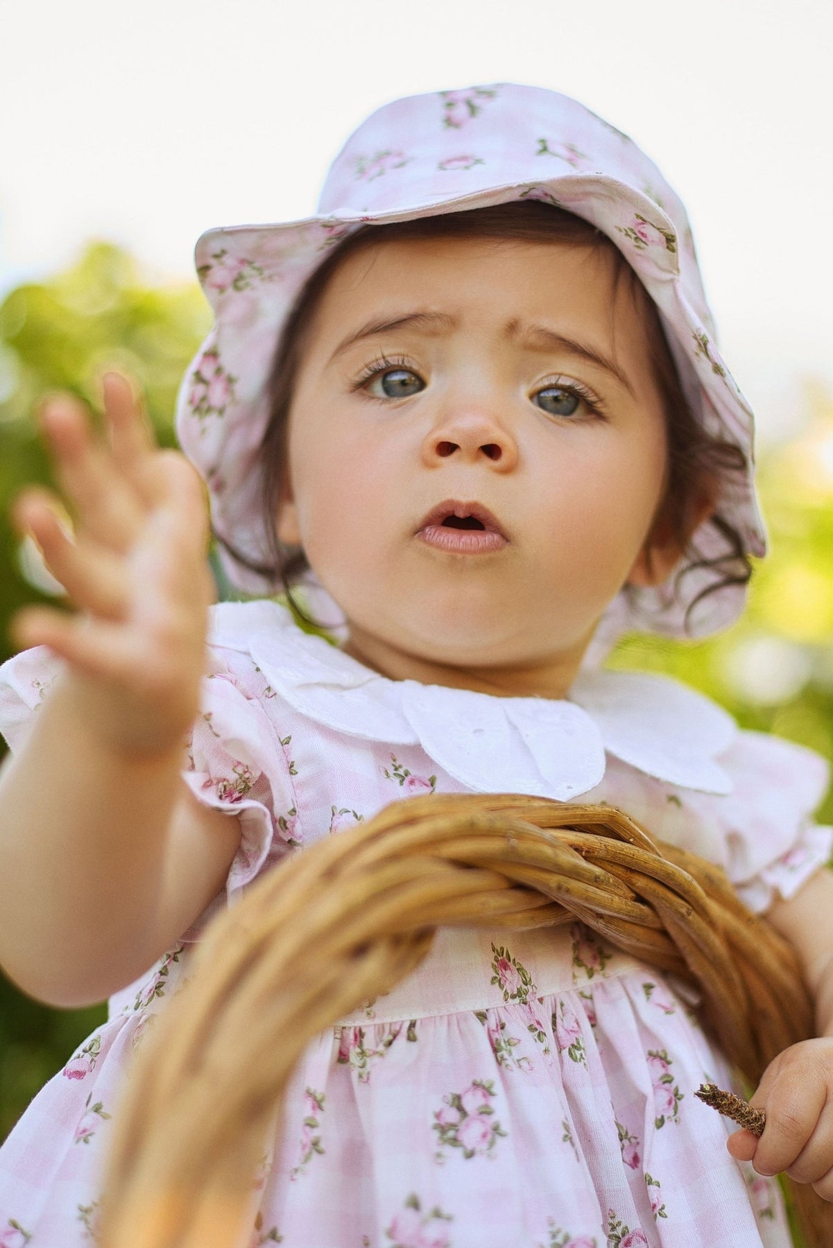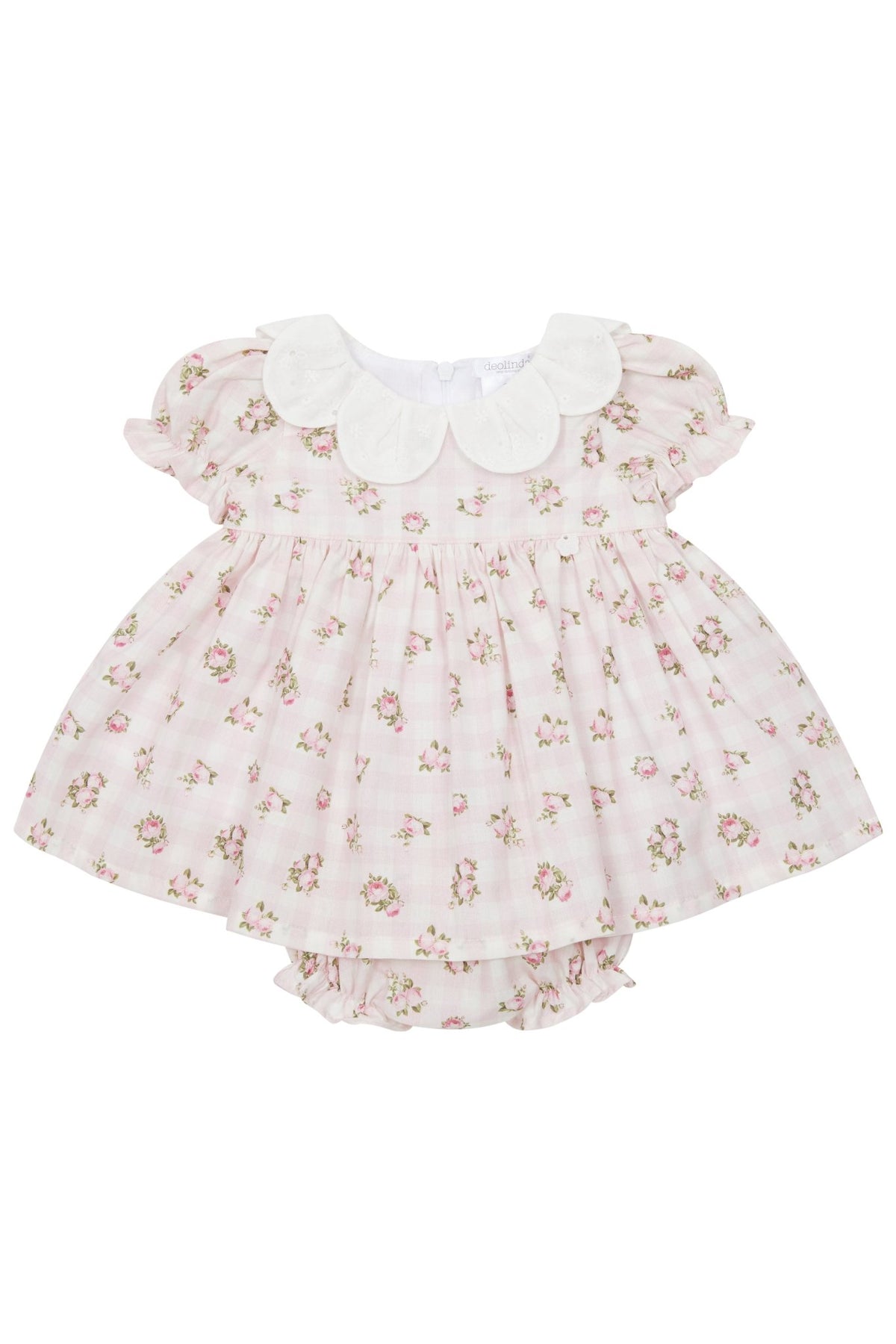 Featuring a soft pink gingham backdrop adorned with delicate floral prints, this dress is as sweet as it is stylish. The white broderie anglaise petal-style collar adds a touch of sophistication, while the flutter sleeves and gathered waist create a classic silhouette. The set includes matching bloomers with an elasticated waist and leg cuffs for a comfortable fit. A zip fastening at the back ensures easy dressing.
