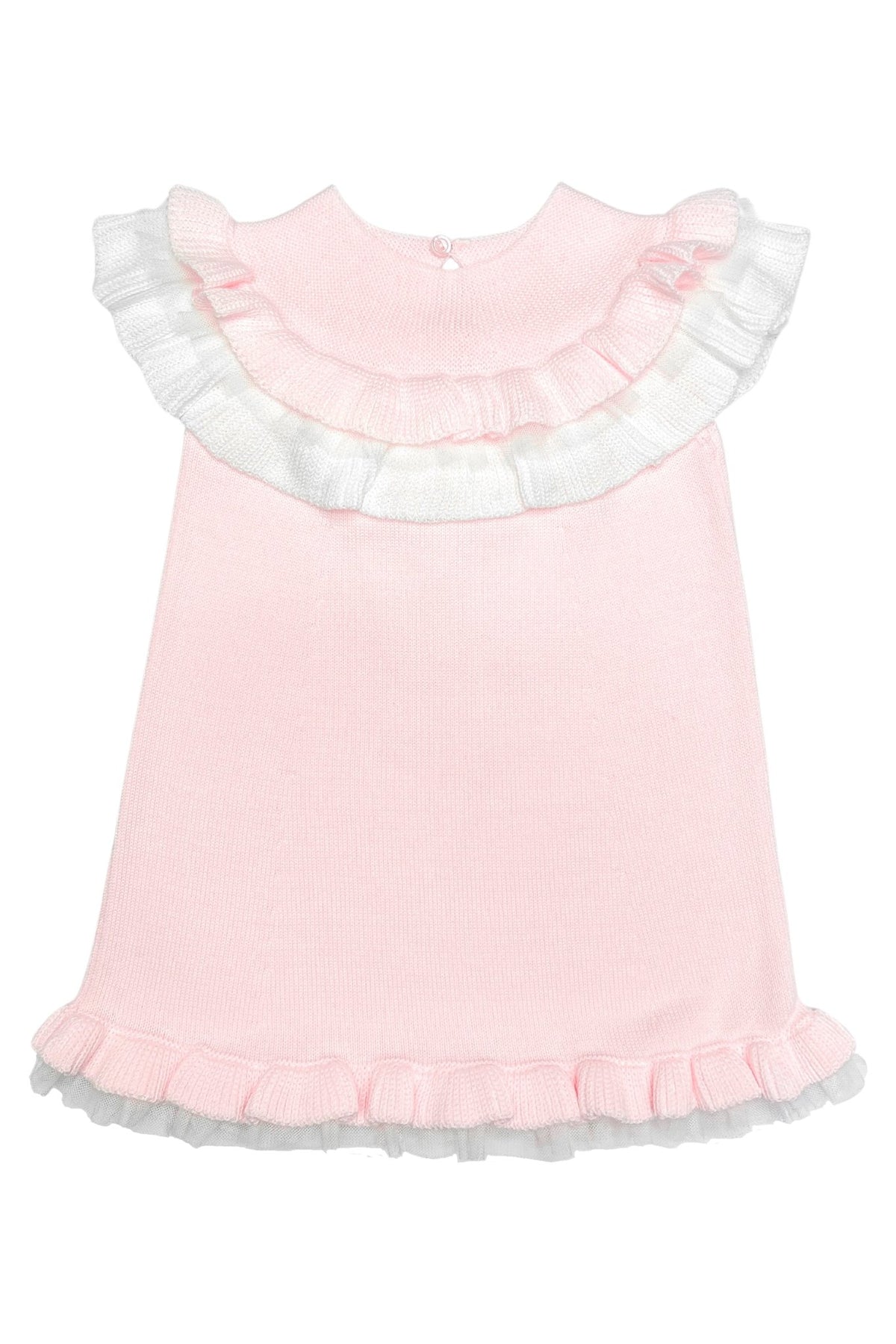 Baby girl's knit dress from Spanish brand Granlei. Baby pink dress made from mid-weight, stretchy knit with girly layered frills around the chest and shoulders, adorned with white tulle trim and a tulle bow to the back.