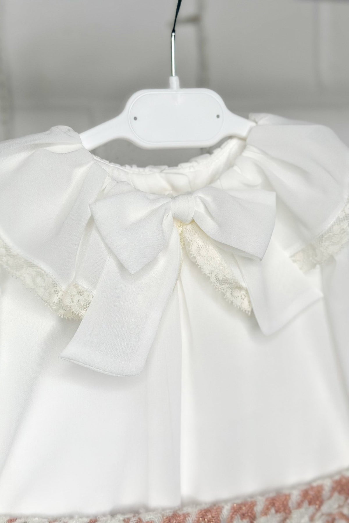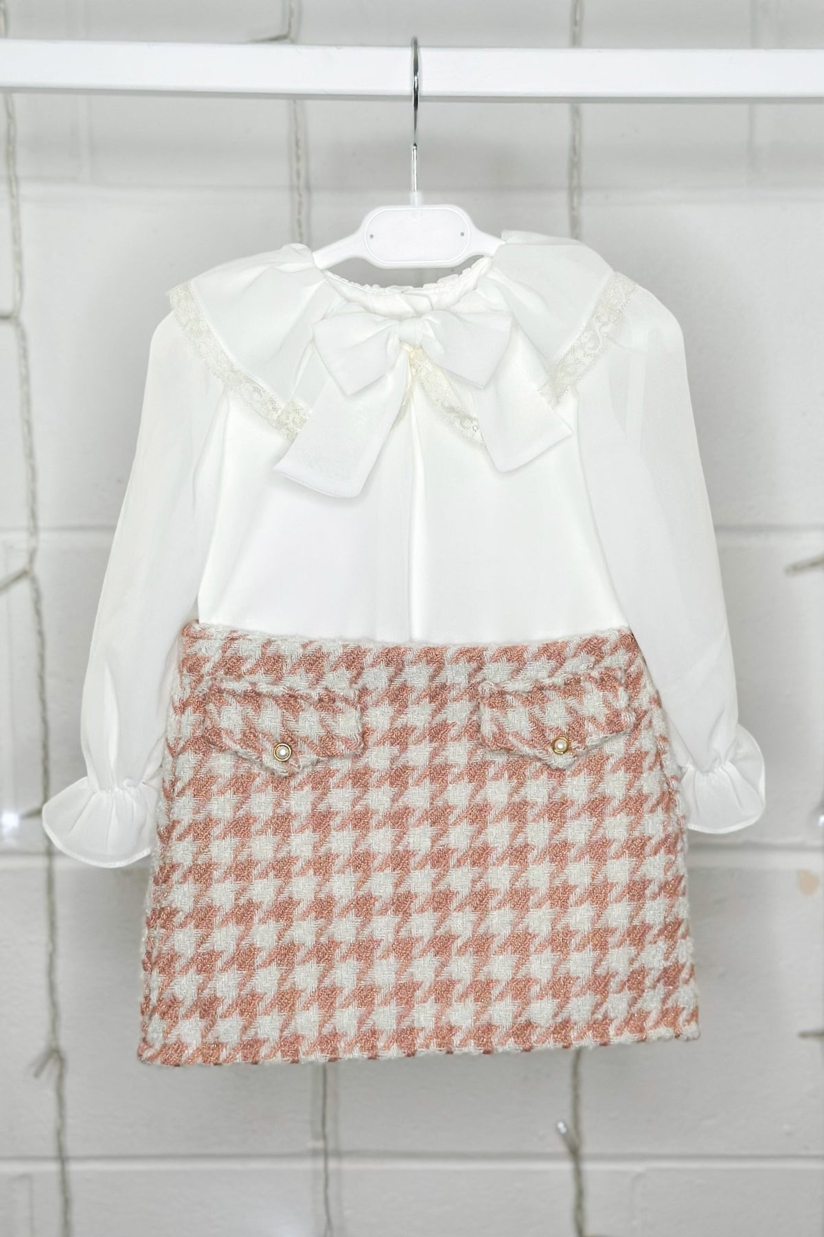 Girl's outfit set from Dutch brand Fofettes. Lightweight ivory long sleeve chiffon blouse with pretty lace trimmed collar, finished with a large bow to the neck, paired with luxurious soft pink knit houndstooth patterned skirt with gold lurex thread intertwined throughout, decorated with two faux pearl buttons.