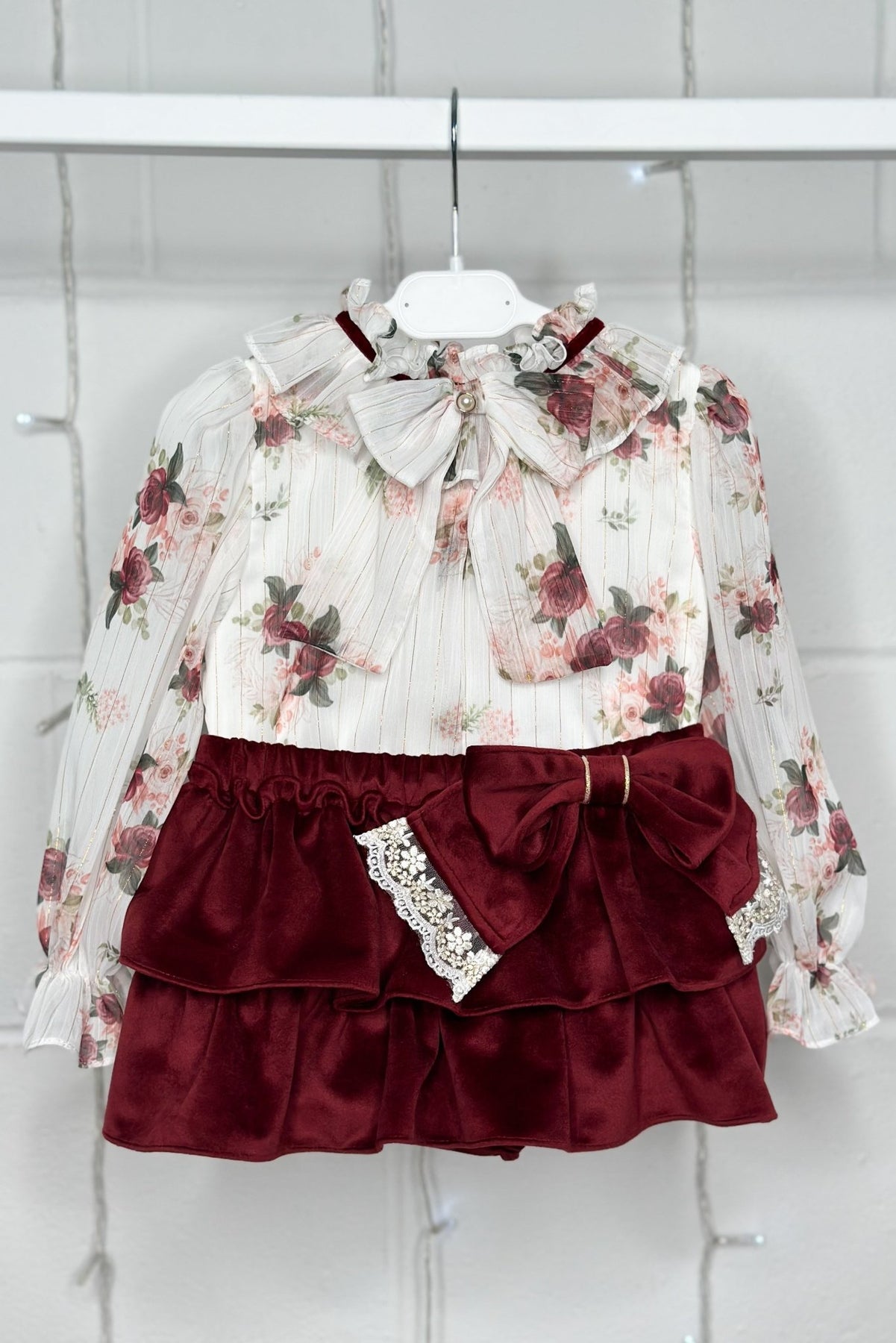 Girl's floral outfit set from Dutch brand Fofettes. Lightweight burgundy vintage floral long sleeve blouse with stylish gold lurex stripes throughout, finished with burgundy velvet trim, frill and a bow to the neck, topped with a faux pearl, paired with super soft luxurious burgundy velvet layered skirt with concealed bloomers, decorated with an extra large bow with lace trims.