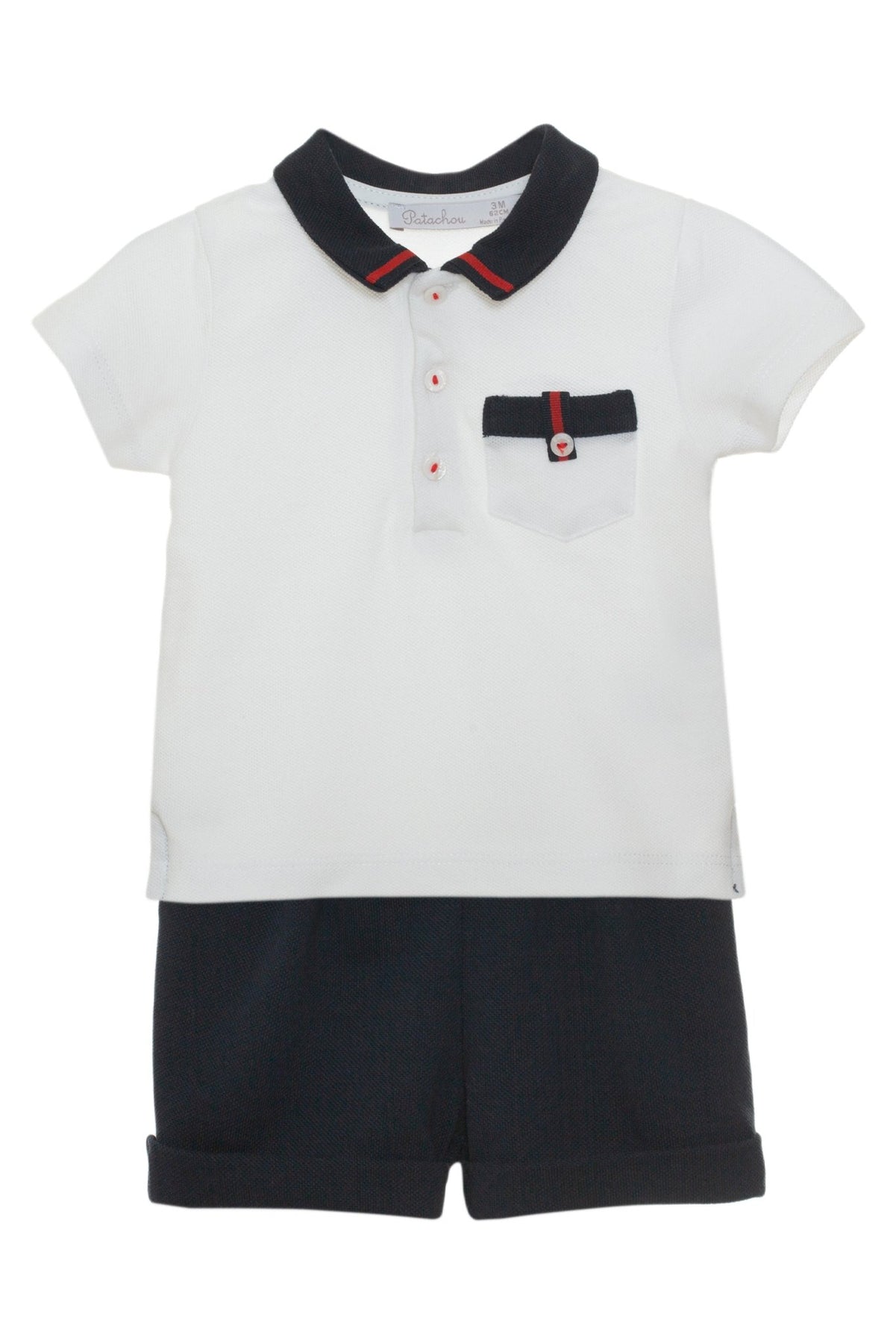 Baby boy's outfit set from Portuguese brand Patachou. White short sleeve polo shirt with eye-catching navy and red striped collar and pocket, paired with matching navy shorts crafted from lightweight, breathable cotton which is gentle on delicate skin, allowing your little one to remain comfortable during their adventures.
