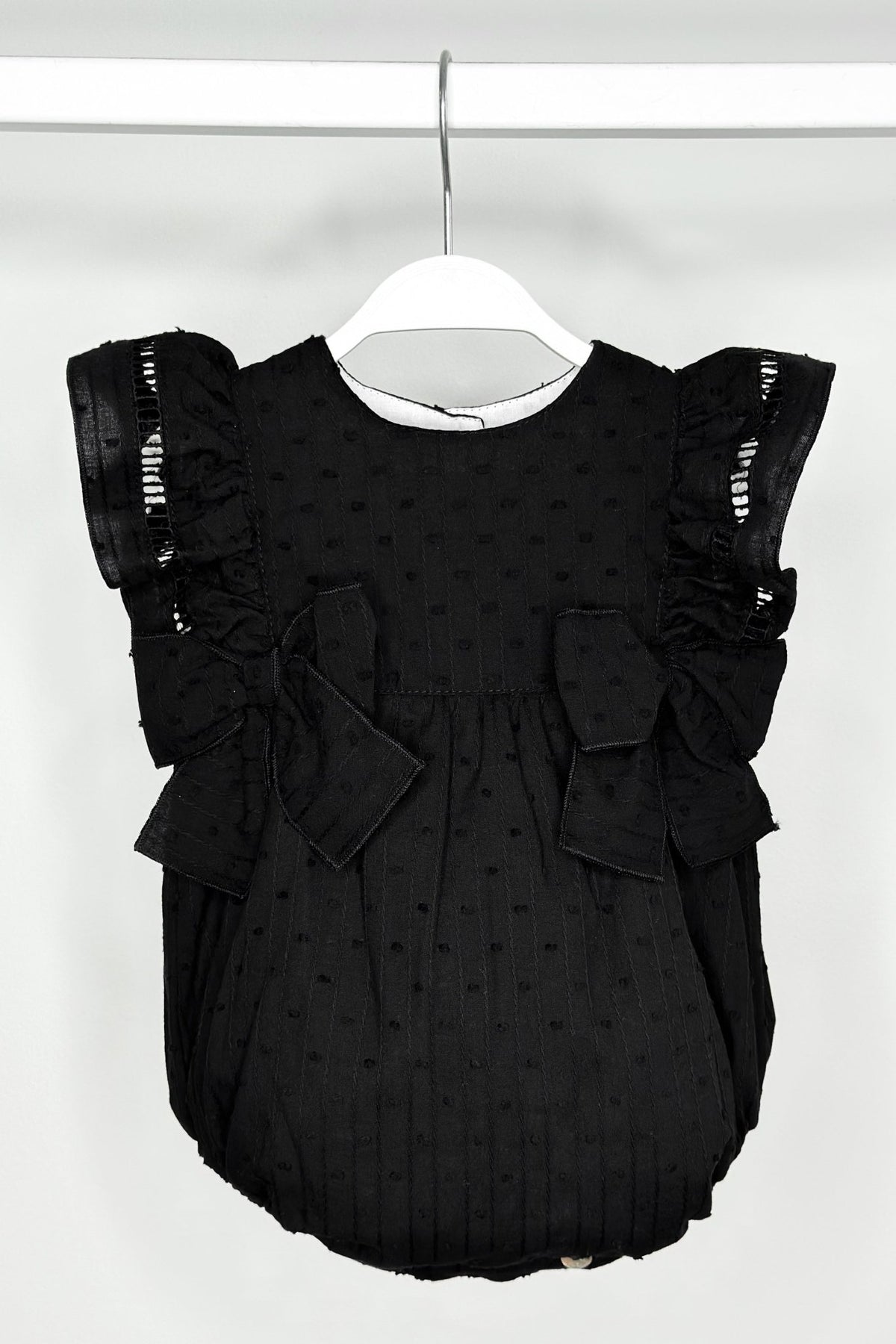 For the sweetest everyday elegance, this Phi Clothing romper is a little black outfit with a playful twist. Crafted in soft, lightweight black plumeti cotton, it’s detailed with oversized frilled sleeves and two darling bows at the waist. The romper is fully lined for comfort, with elasticated cuffs for wriggly little legs. Natural mother of pearl buttons at the back and crutch make dressing and changing fuss-free, so it’s as practical as it is charming. A timeless piece that looks just as lovely for family outings as it does for special occasions.