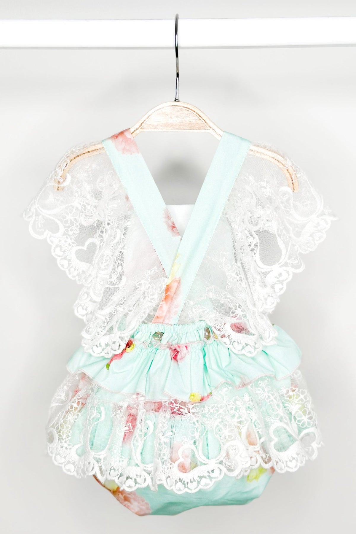 "Peaches" Aquamarine Pink Peony Lace Dungaree Romper