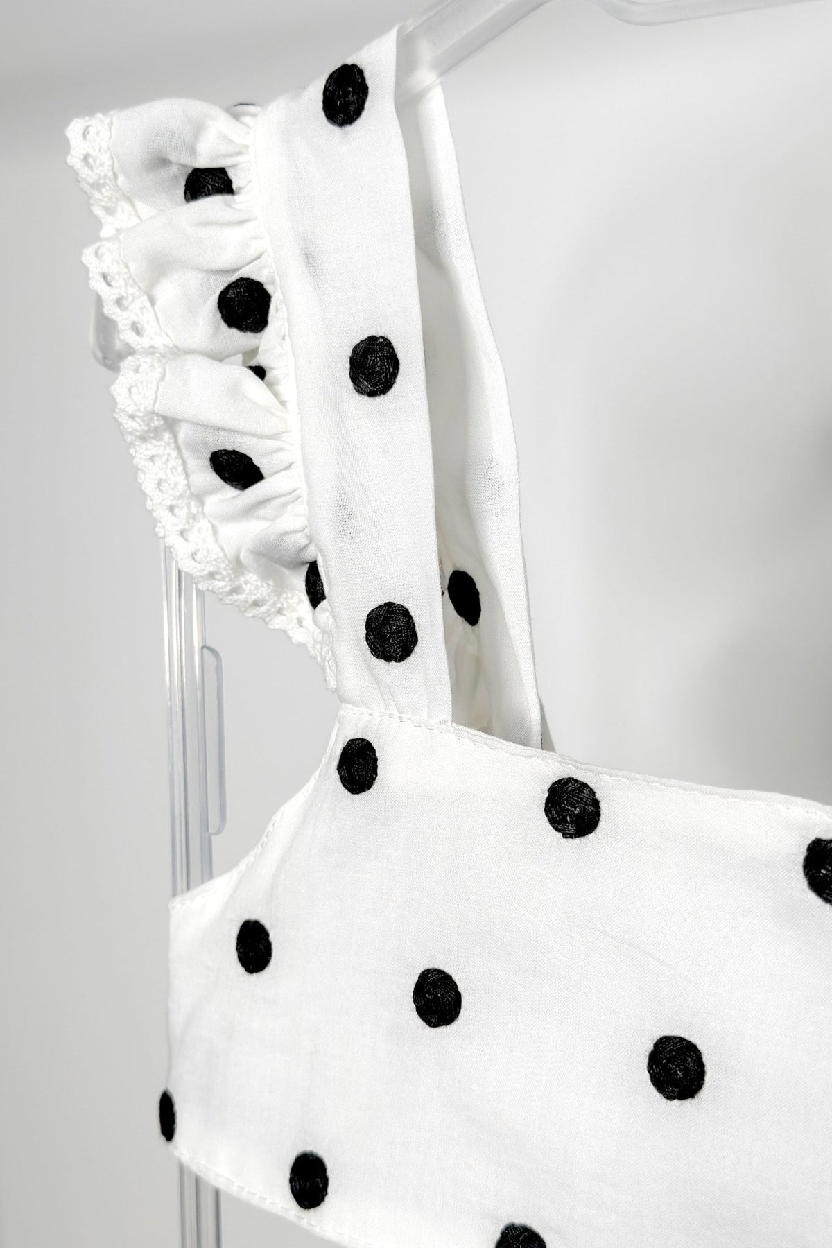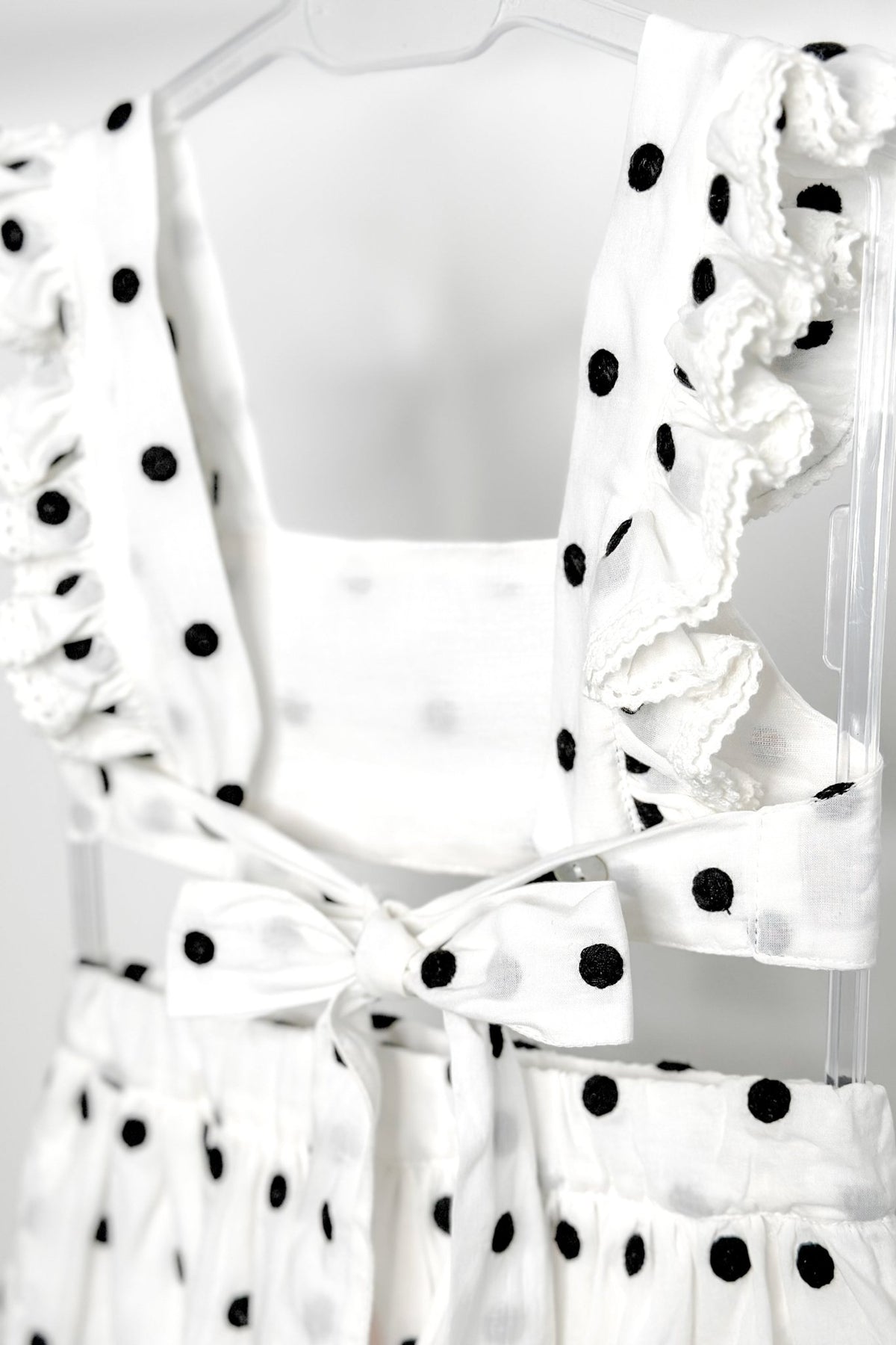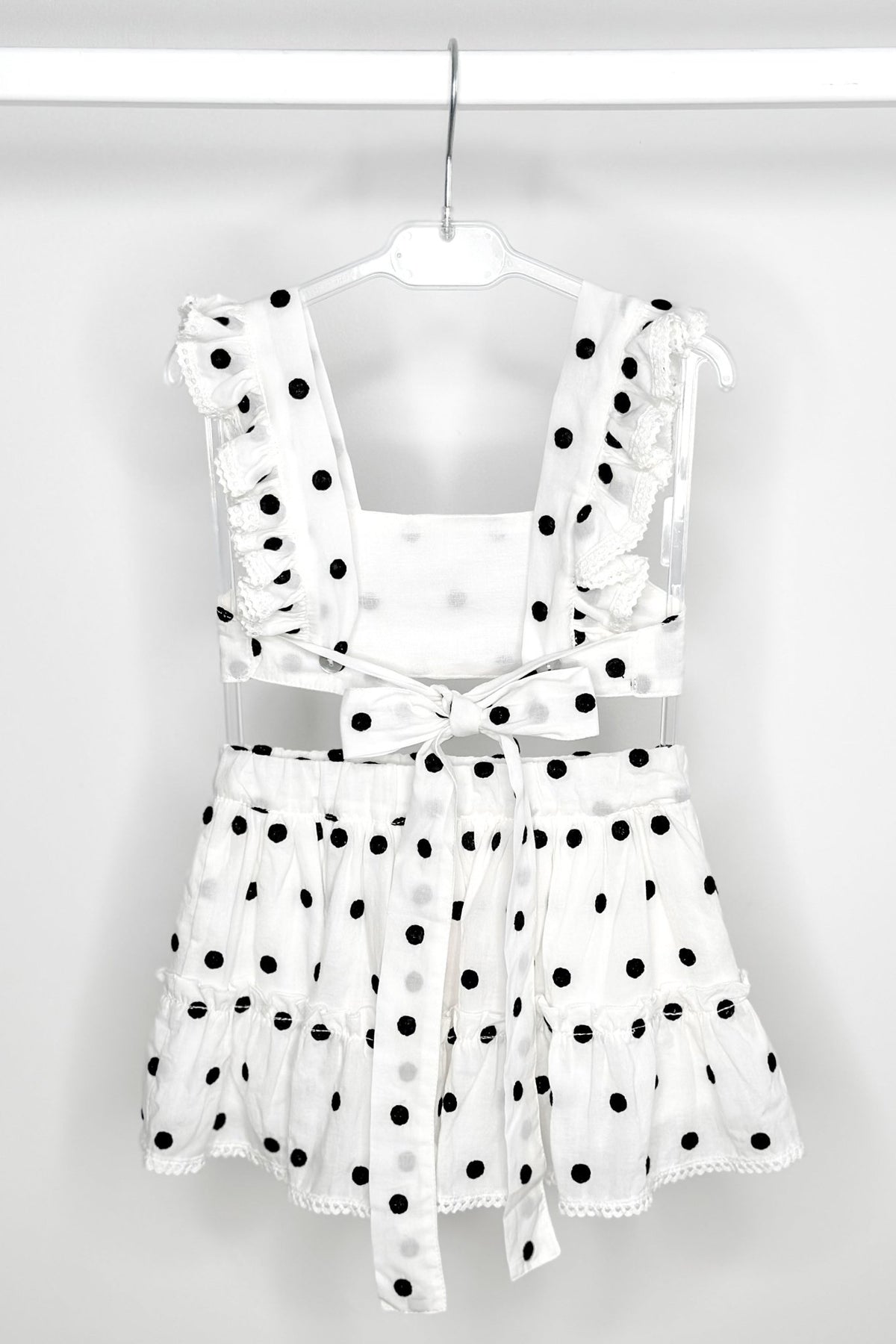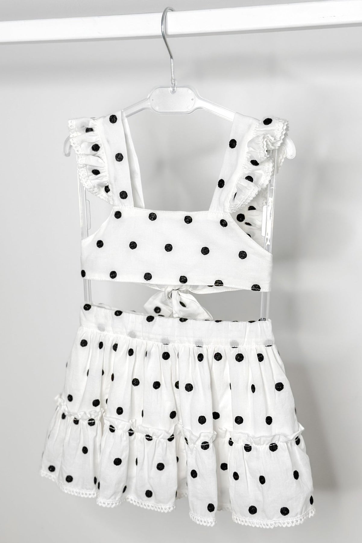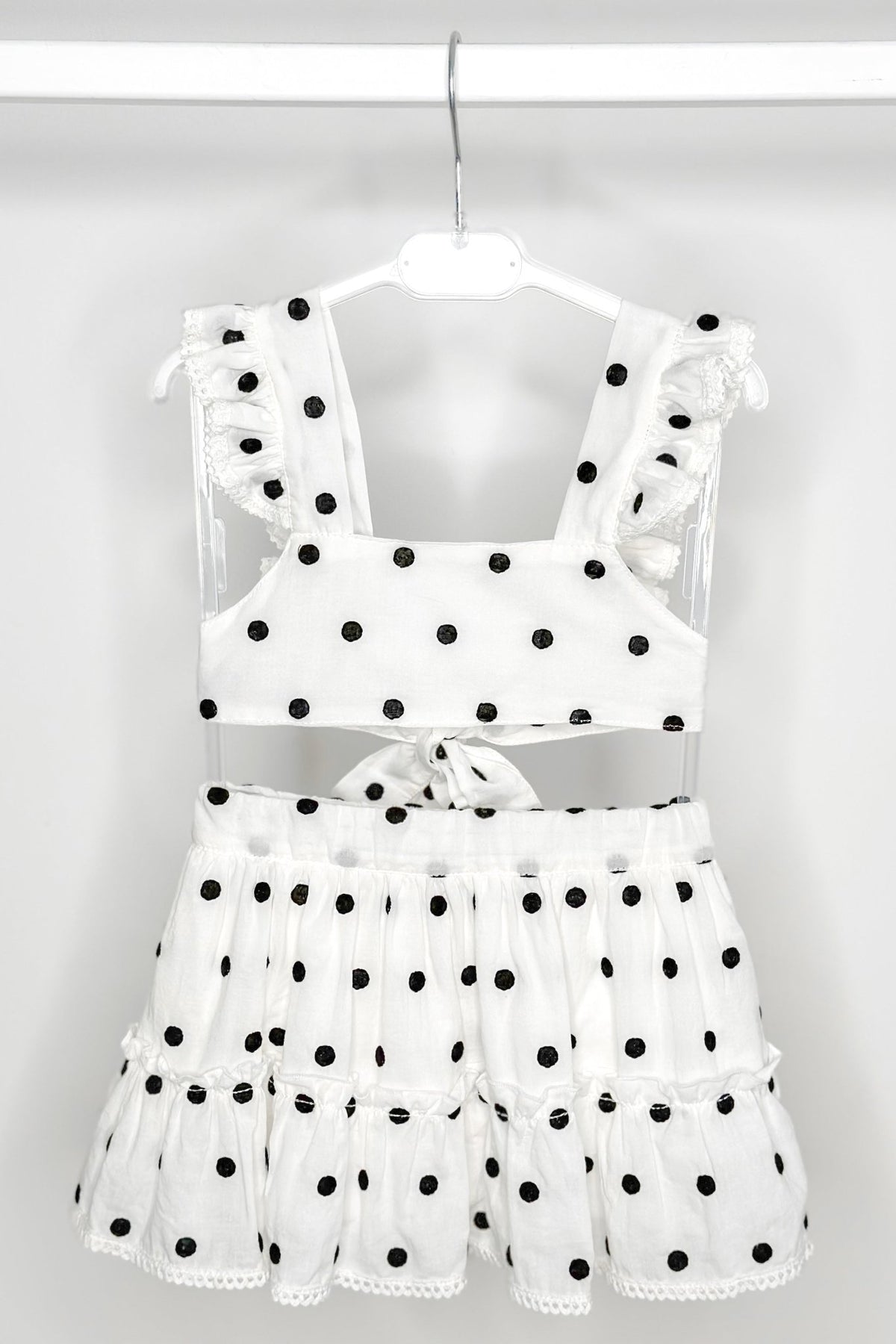 A playful twist on timeless style, this Phi Clothing set is made for little fashionistas who love to stand out. Crafted from soft, lightweight white cotton, it’s decorated with bold black embroidered polka dots that pop against the crisp background. The crop top features ruffled straps edged with delicate ivory crochet lace, tying into a sweet bow at the back for a picture-perfect finish. Paired with a twirl-ready tiered skirt, complete with an adjustable elasticated waist and lining for comfort, this is an outfit that balances charm and practicality effortlessly. Ideal for sunny days, special gatherings, or simply when she wants to feel extra fabulous.